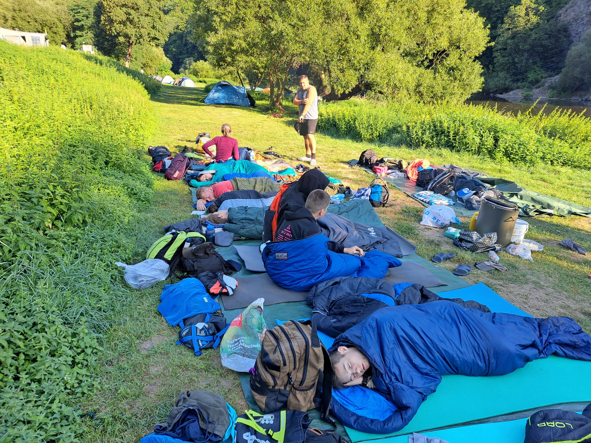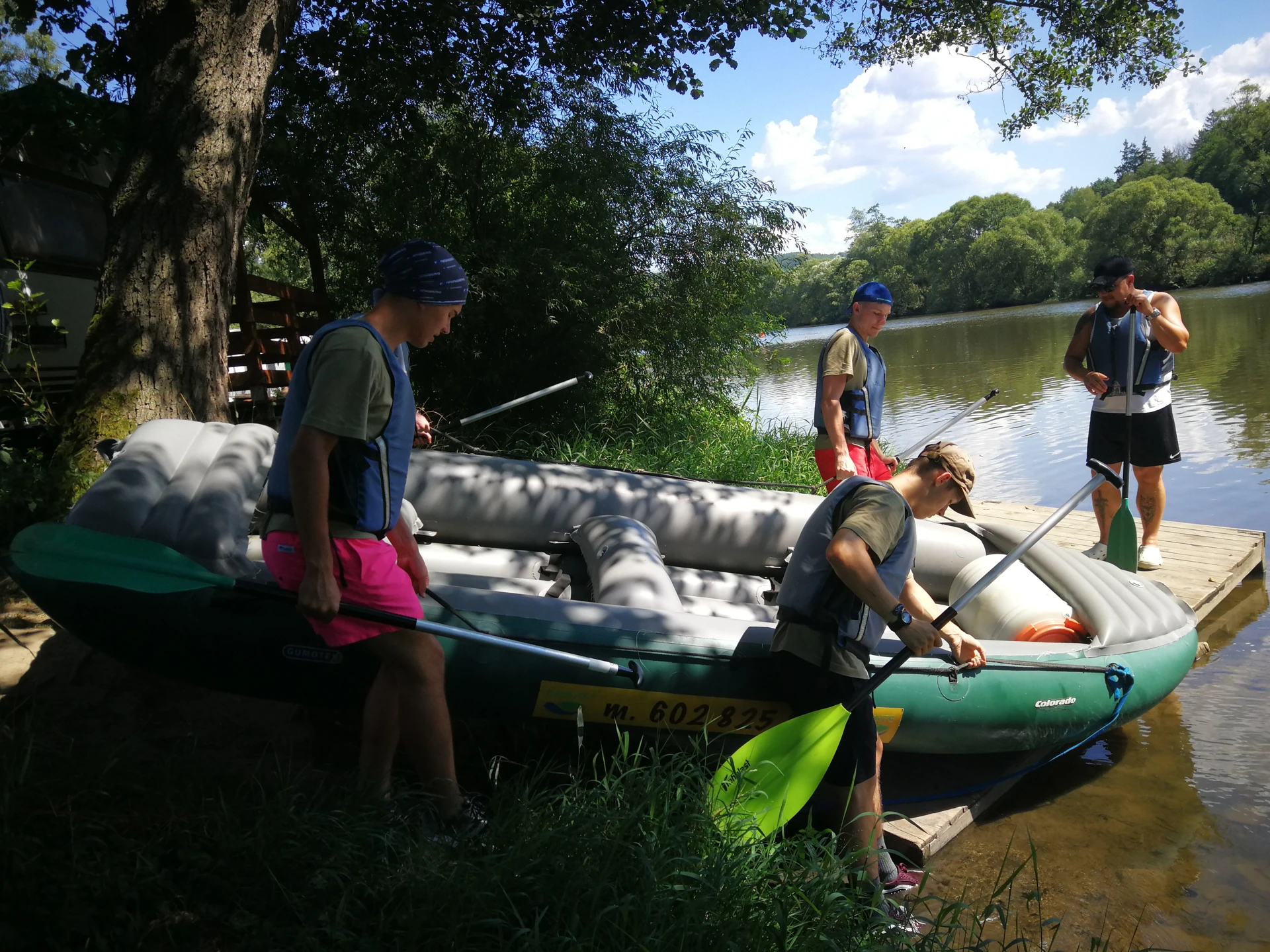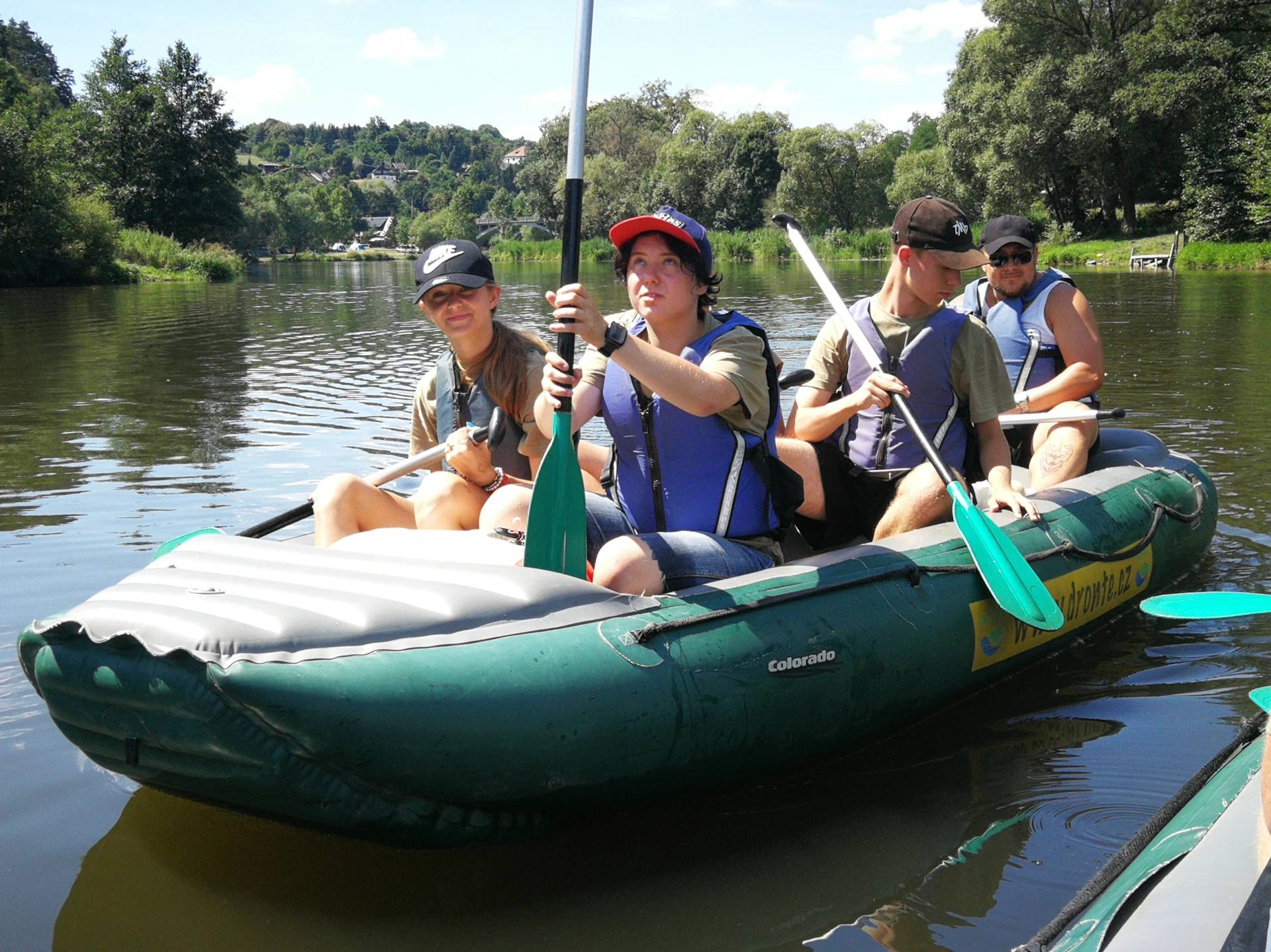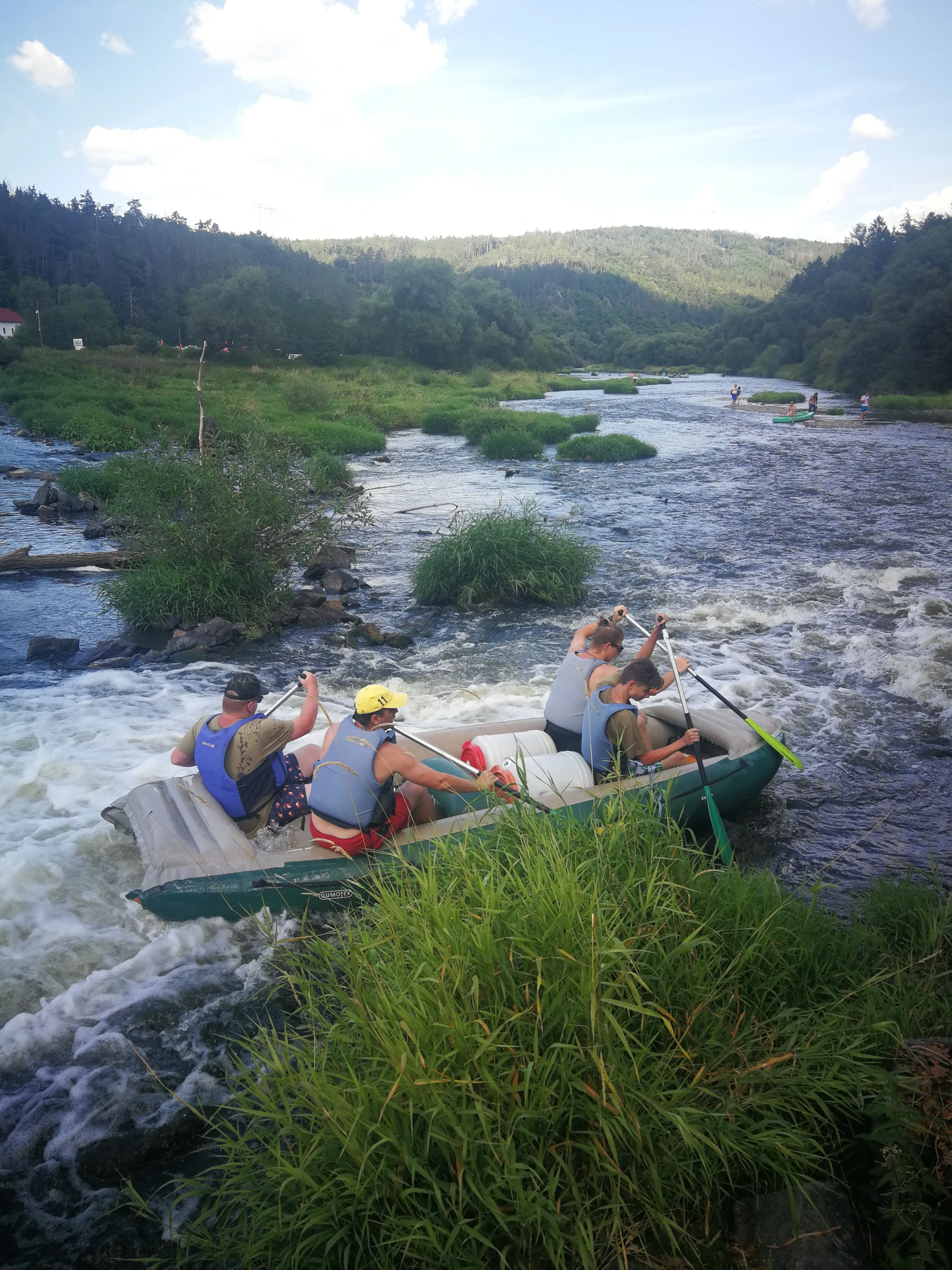 Juniorská parta vyrazila včera po snídani na terénních koloběžkách krásnými úvozy křivoklátské CHKO až do údolí Berounky – do Zvíkovce. Zde na ně už čekaly rafty a přibližně 8 km dlouhá, pohodová plavba po řece. Ve vyhlášeném kempu Ahoj! pak u táboráku zavzpomínali na dětská léta a došlo jistě i na plány do budoucna a vyhlídky na pozice praktikantů DVOJKY.