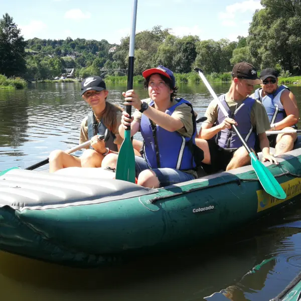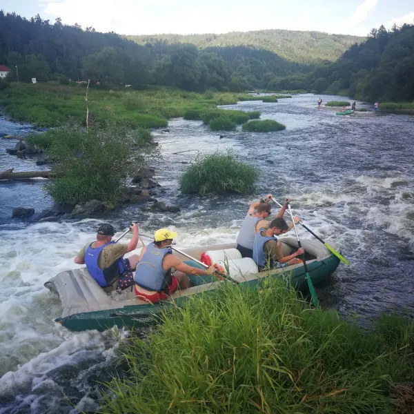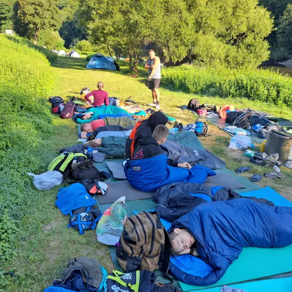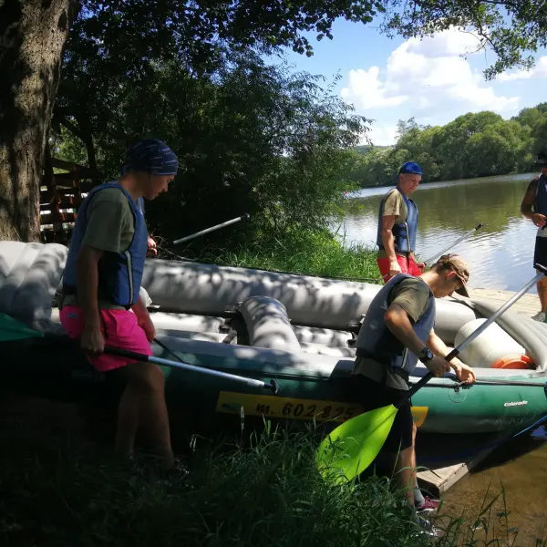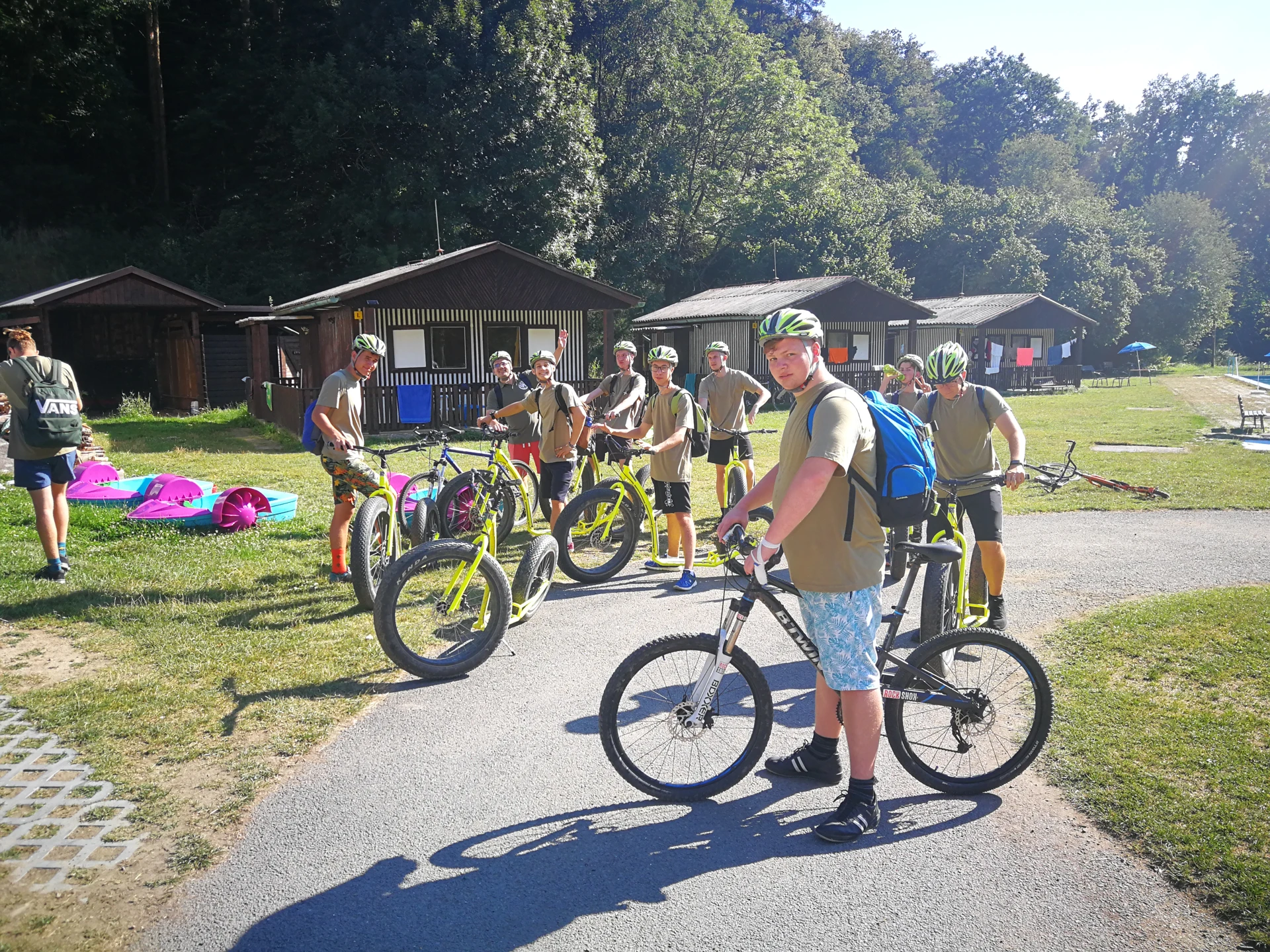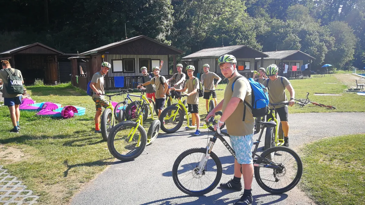 Juniorská parta vyrazila včera po snídani na terénních koloběžkách krásnými úvozy křivoklátské CHKO až do údolí Berounky – do Zvíkovce. Zde na ně už čekaly rafty a přibližně 8 km dlouhá, pohodová plavba po řece. Ve vyhlášeném kempu Ahoj! pak u táboráku zavzpomínali na dětská léta a došlo jistě i na plány do budoucna a vyhlídky na pozice praktikantů DVOJKY.