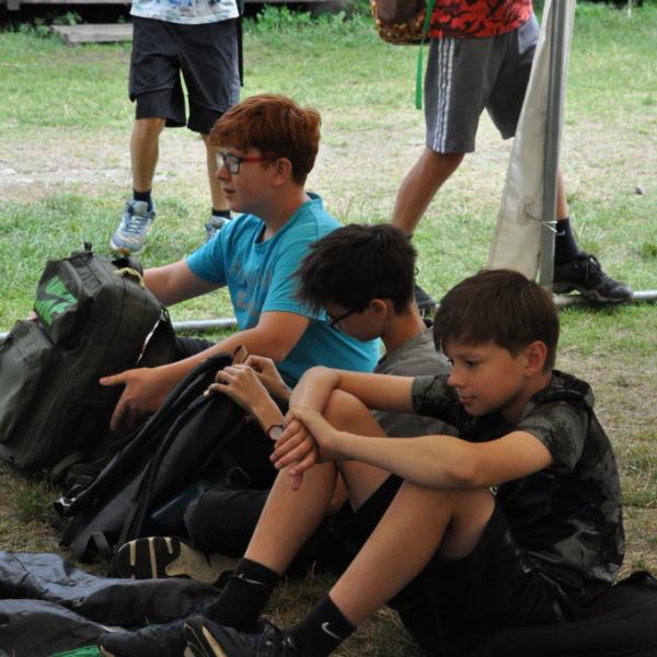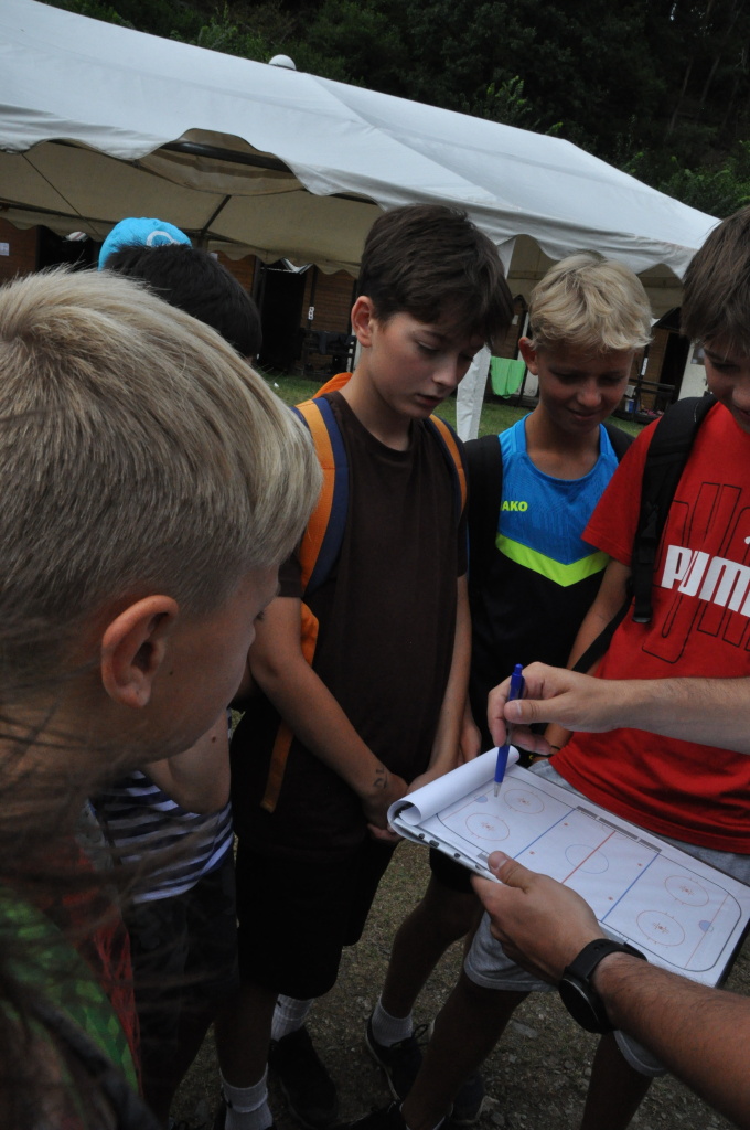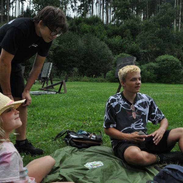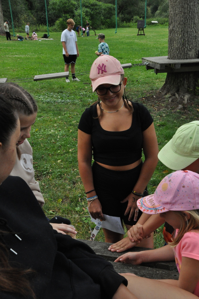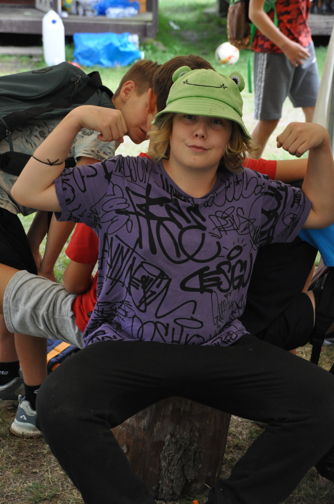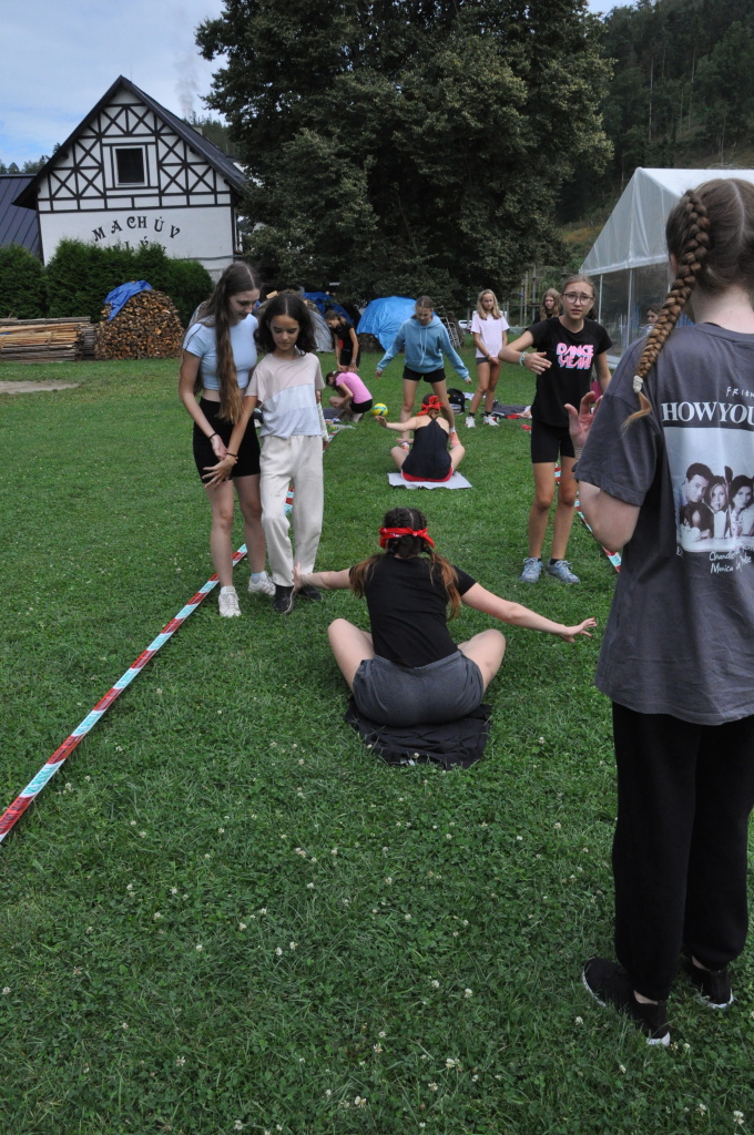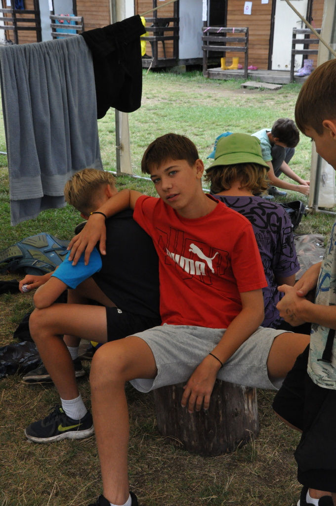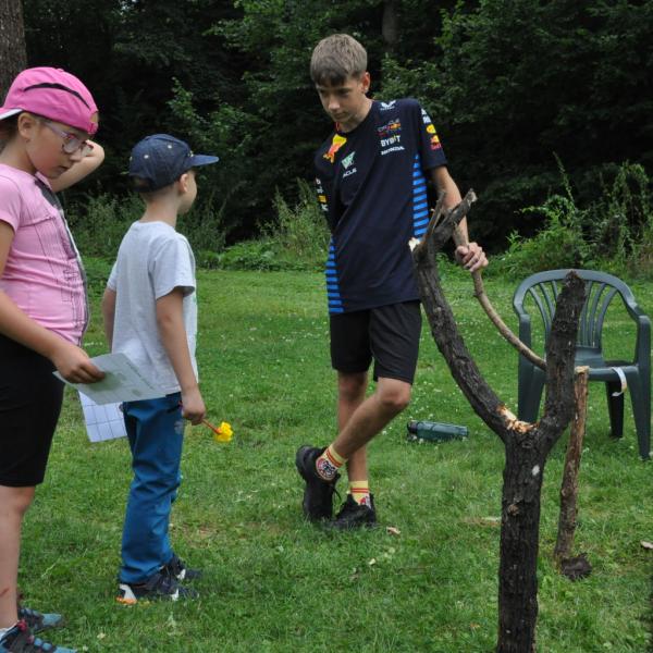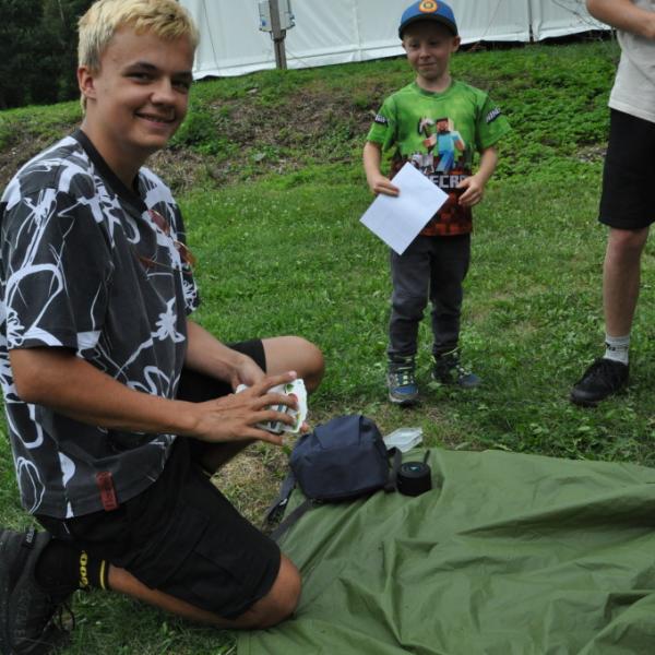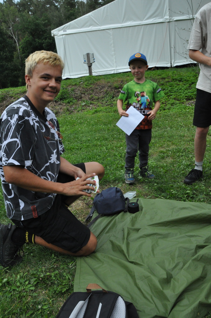 Odpoledne si pak vzaly do své režie nejstarší dva oddíly, které přichystaly moc pěkný program pro nejmenší dva oddíly. Nejmladší kluci a holky měli přichystaná stanoviště, na kterých se jim hoši a děvčata z devítky a desítky věnovali, hráli si s nimi, učili je tábornické dovednosti, stavět ohně, uzlovat apod. Zbytek tábora si pak užíval jednu z posledních možností zahrát si nějaké hry v oddílech. Poslední část tábora, která se nezadržitelně blíží, je totiž zaměřená spíše na táborové dominanty, Ty oddíly, které se cítily být při síle, nazuly toulavé boty a ušlápnout pár kilásků do přírody. Junioři si vzali za cíl návštěvu civilizace a navštívili nedalekou obec Chříč. Ano, je to ta, kam nám od vás chodí pošta. Možnost koupit s v krámku něco na zub byla patrně nejen velkou motivací, ale i náplastí na ušlé kilometry.