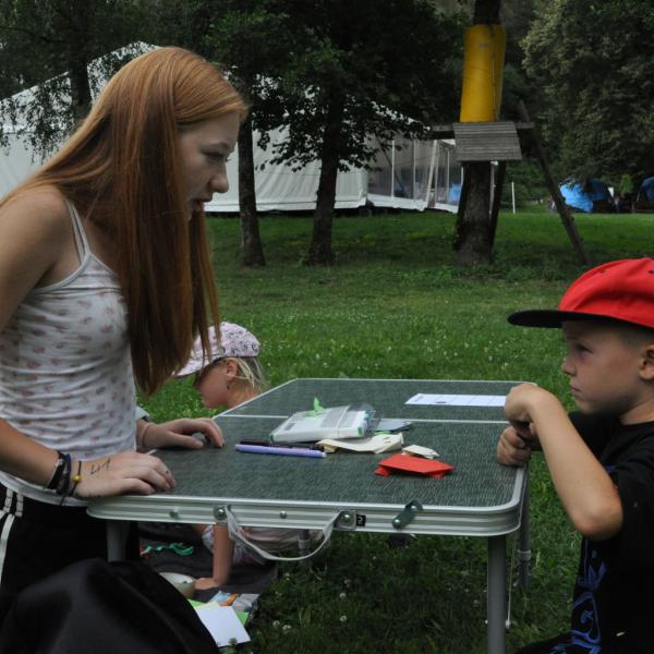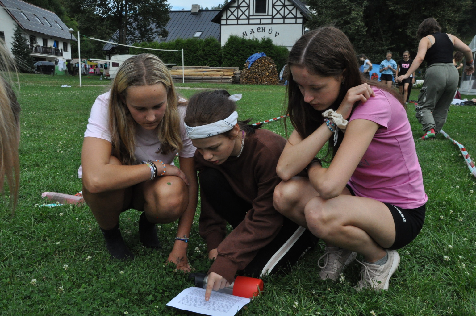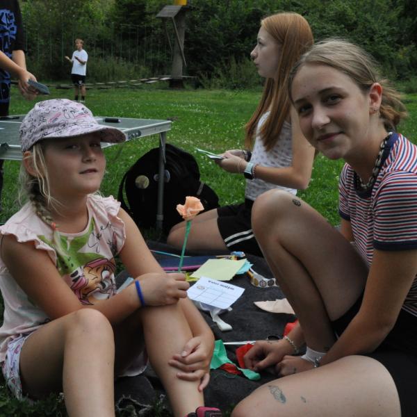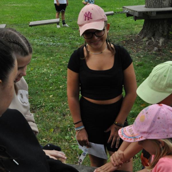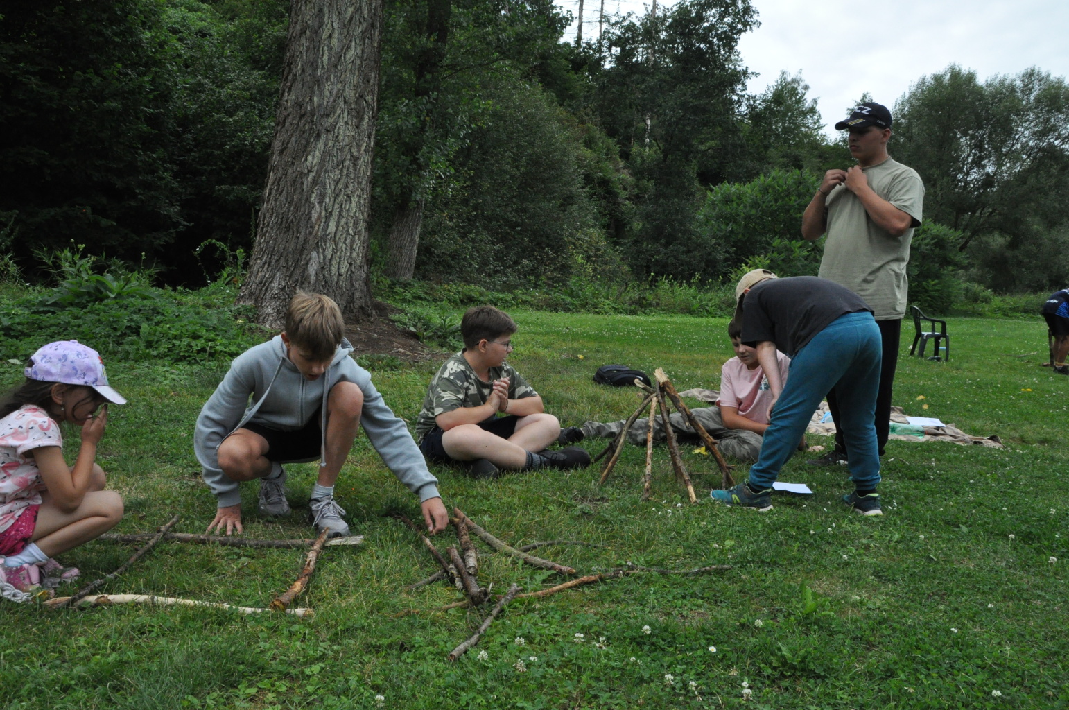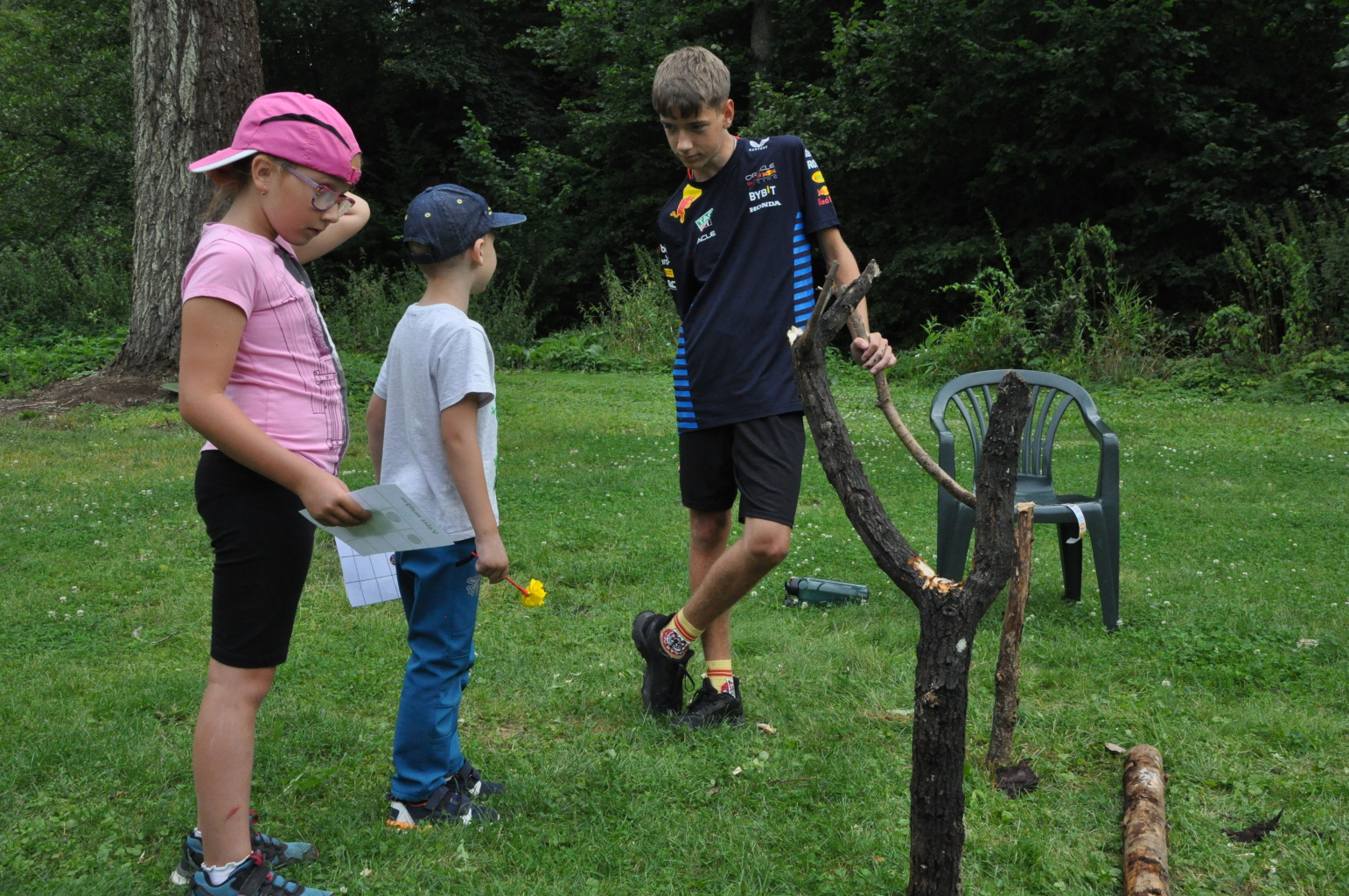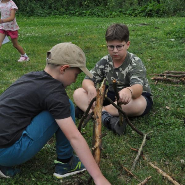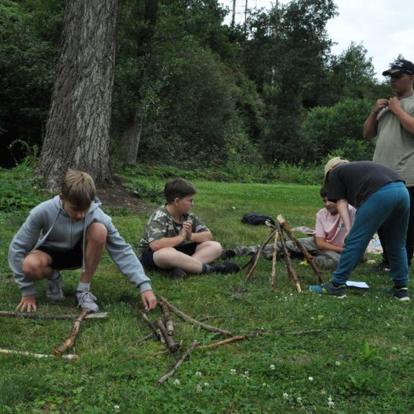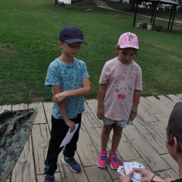 Odpoledne si pak vzaly do své režie nejstarší dva oddíly, které přichystaly moc pěkný program pro nejmenší dva oddíly. Nejmladší kluci a holky měli přichystaná stanoviště, na kterých se jim hoši a děvčata z devítky a desítky věnovali, hráli si s nimi, učili je tábornické dovednosti, stavět ohně, uzlovat apod. Zbytek tábora si pak užíval jednu z posledních možností zahrát si nějaké hry v oddílech. Poslední část tábora, která se nezadržitelně blíží, je totiž zaměřená spíše na táborové dominanty, Ty oddíly, které se cítily být při síle, nazuly toulavé boty a ušlápnout pár kilásků do přírody. Junioři si vzali za cíl návštěvu civilizace a navštívili nedalekou obec Chříč. Ano, je to ta, kam nám od vás chodí pošta. Možnost koupit s v krámku něco na zub byla patrně nejen velkou motivací, ale i náplastí na ušlé kilometry.