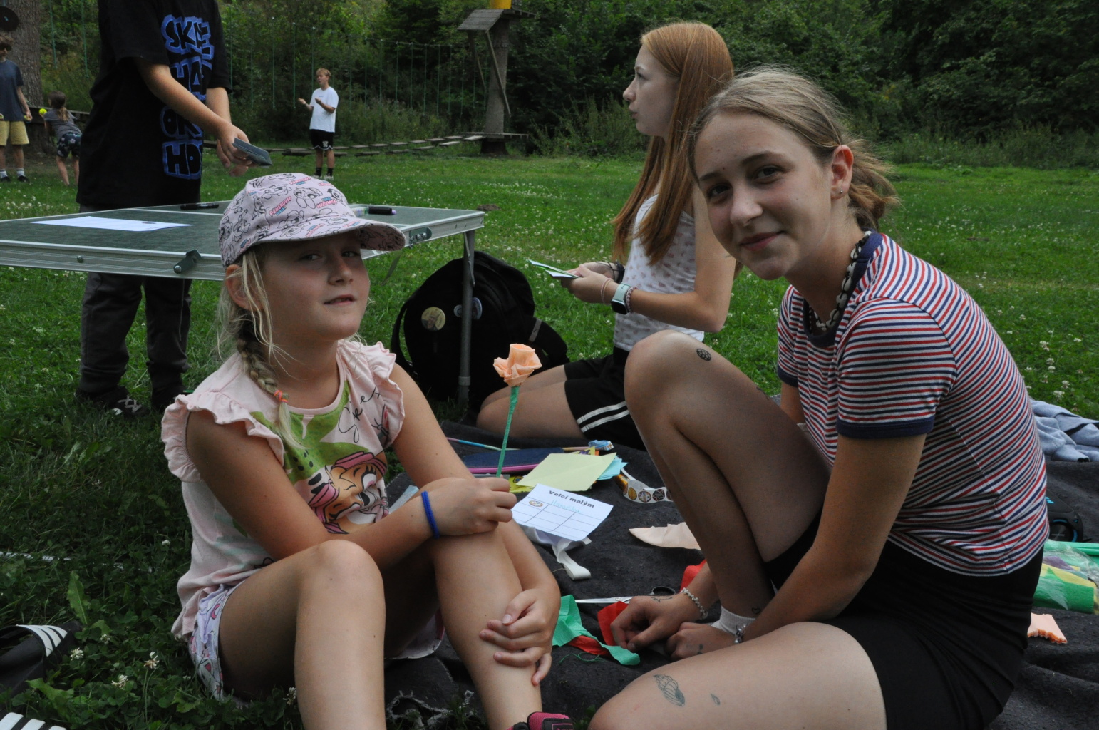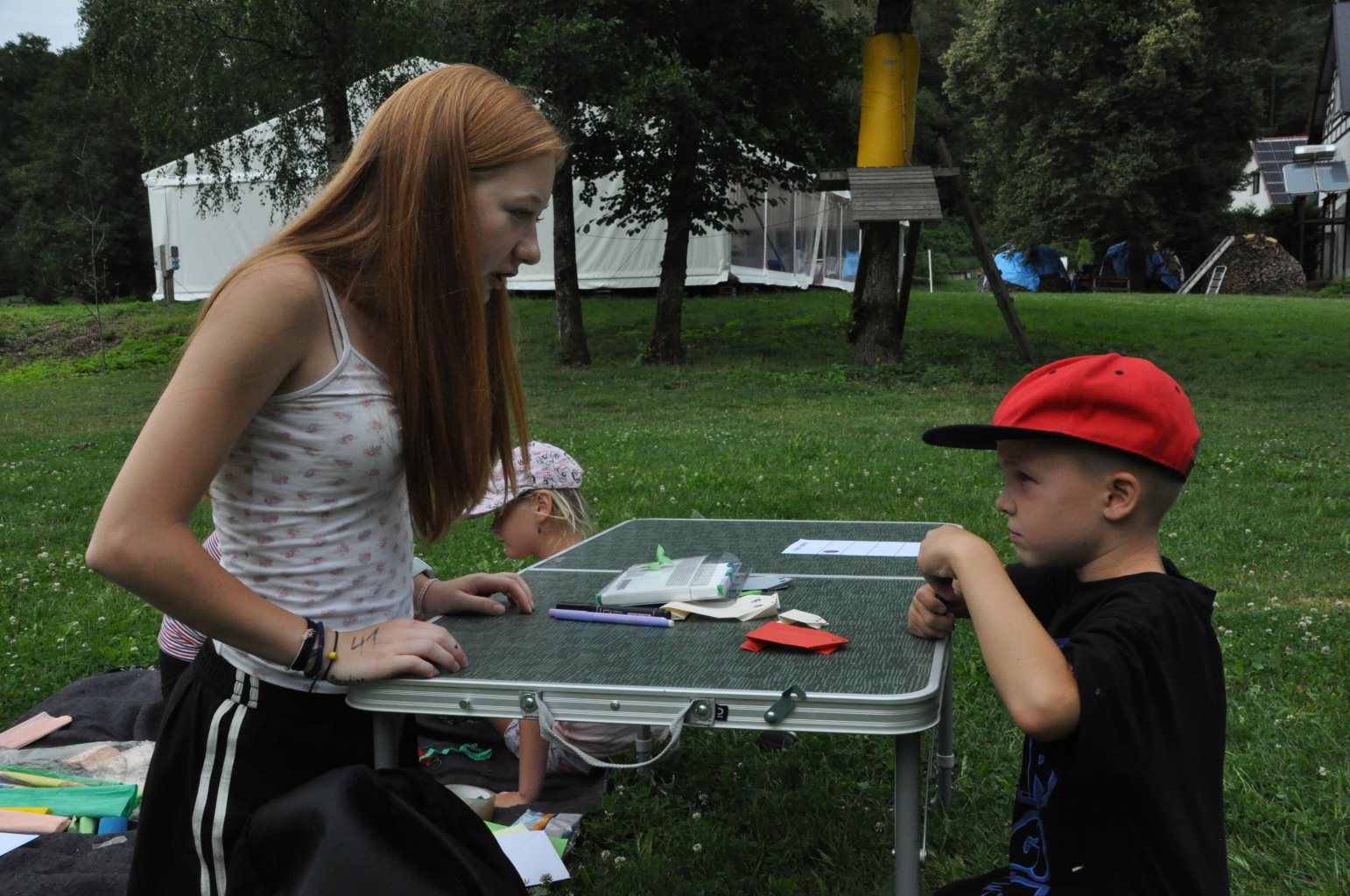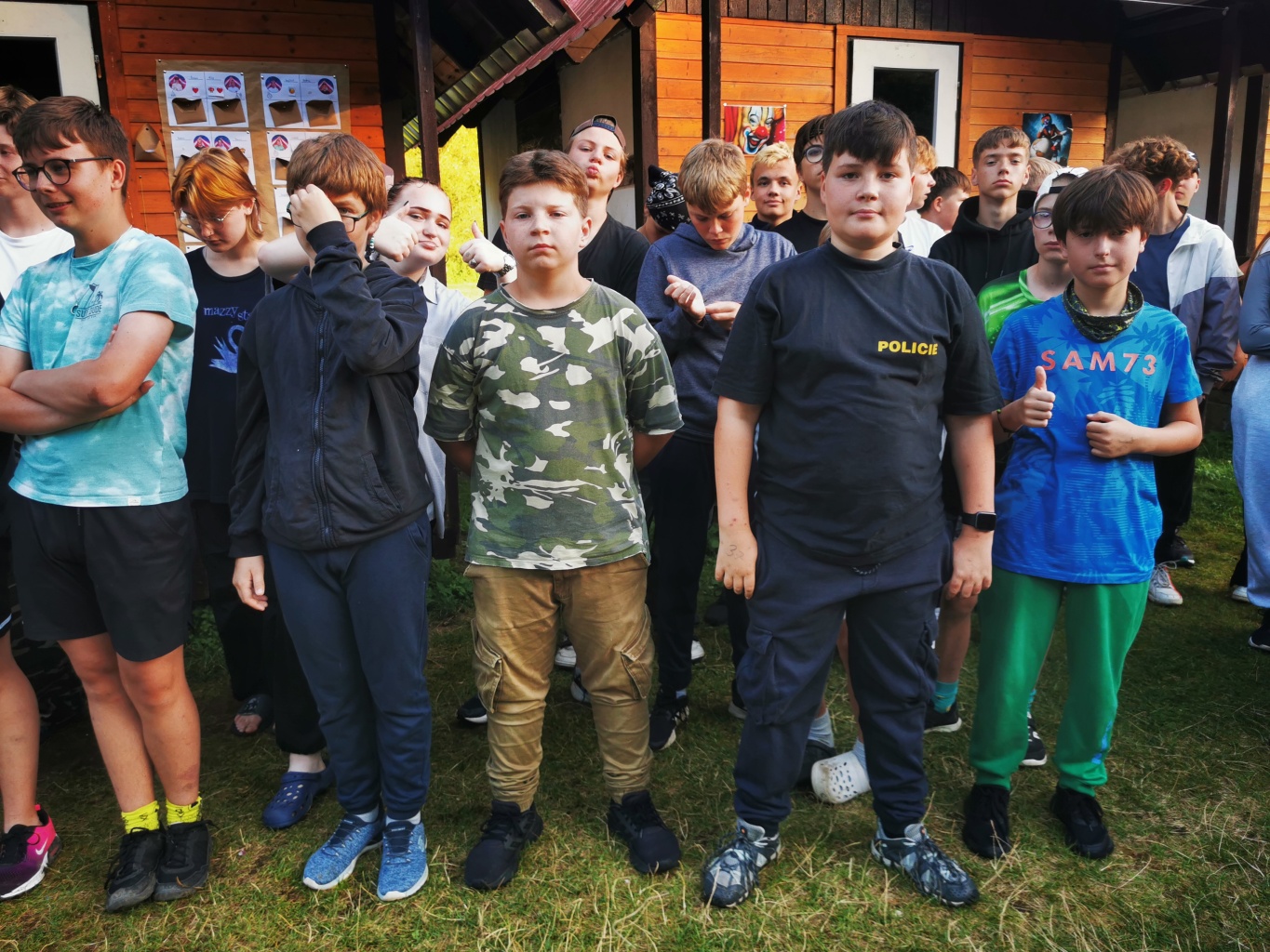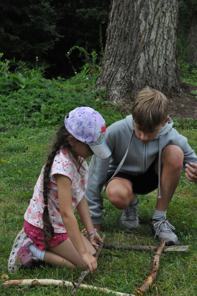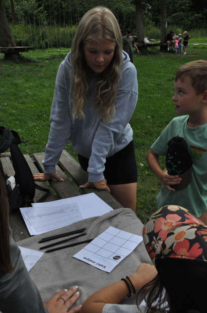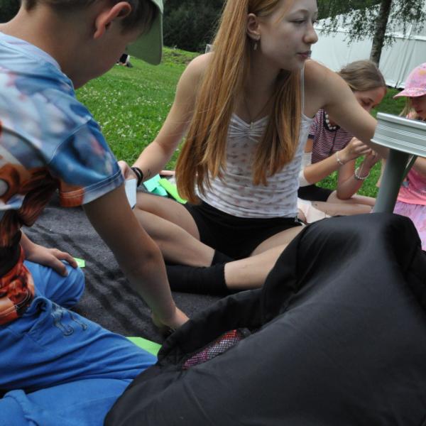 Odpoledne si pak vzaly do své režie nejstarší dva oddíly, které přichystaly moc pěkný program pro nejmenší dva oddíly. Nejmladší kluci a holky měli přichystaná stanoviště, na kterých se jim hoši a děvčata z devítky a desítky věnovali, hráli si s nimi, učili je tábornické dovednosti, stavět ohně, uzlovat apod. Zbytek tábora si pak užíval jednu z posledních možností zahrát si nějaké hry v oddílech. Poslední část tábora, která se nezadržitelně blíží, je totiž zaměřená spíše na táborové dominanty, Ty oddíly, které se cítily být při síle, nazuly toulavé boty a ušlápnout pár kilásků do přírody. Junioři si vzali za cíl návštěvu civilizace a navštívili nedalekou obec Chříč. Ano, je to ta, kam nám od vás chodí pošta. Možnost koupit s v krámku něco na zub byla patrně nejen velkou motivací, ale i náplastí na ušlé kilometry.