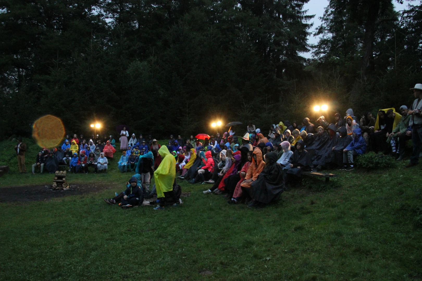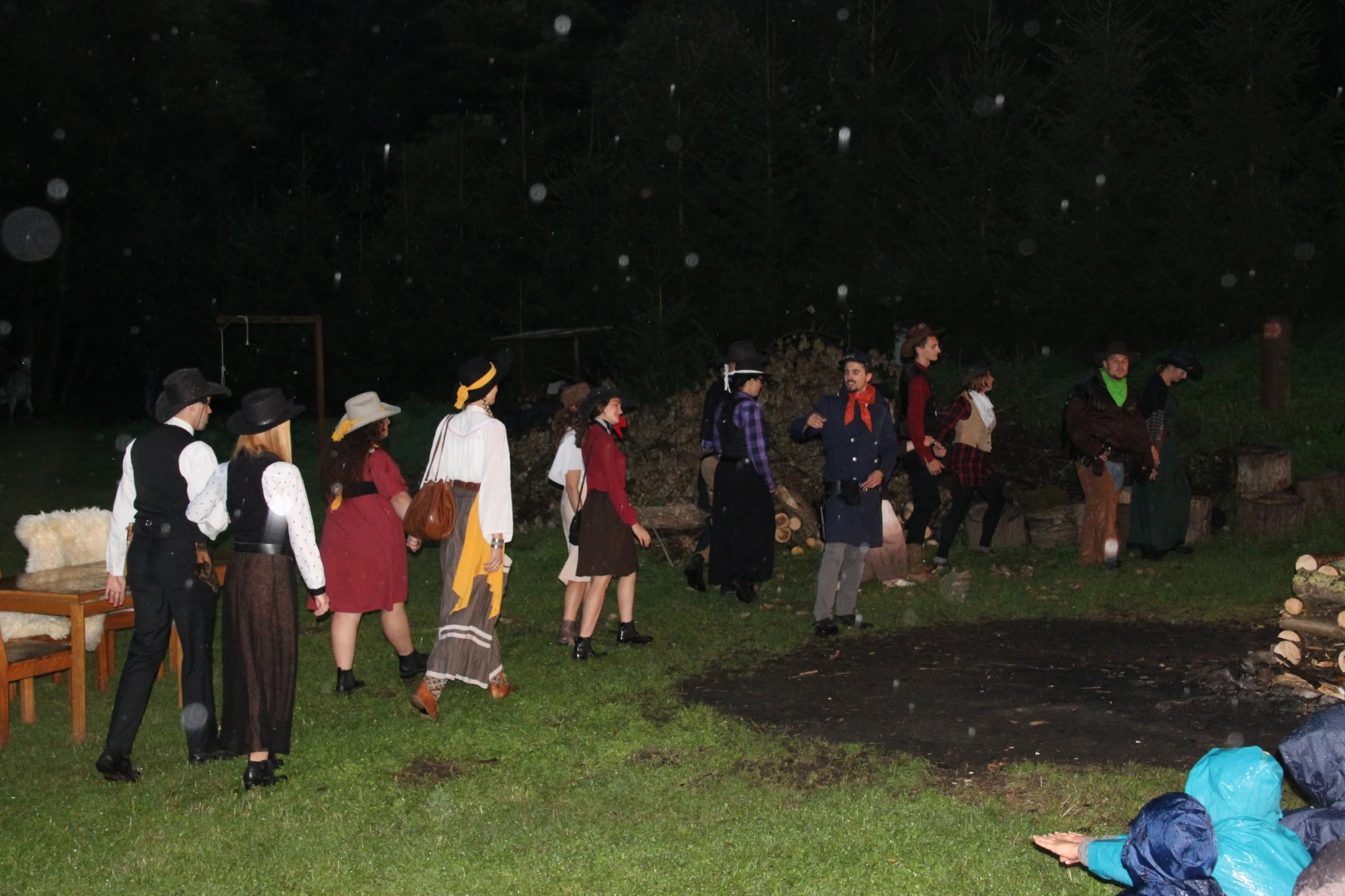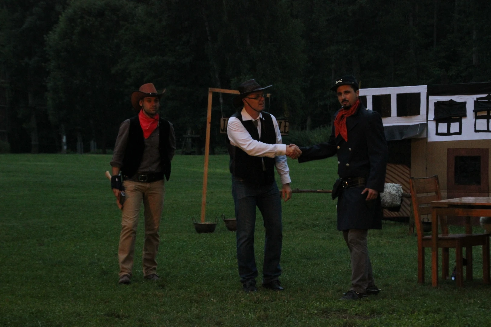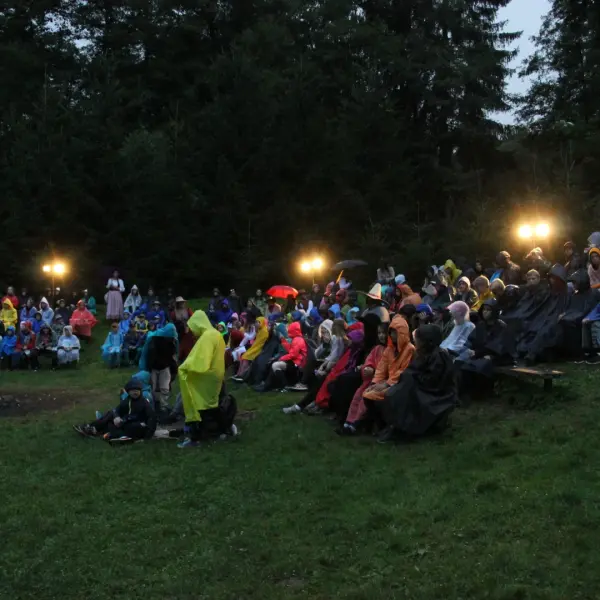 Večer jsme zahájili „celotáborovku“. No, zahájili…. Sotva jsme se s dětmi sešli na „place“, nebe se zatáhlo a začalo jemně pršet. „To dáme! Děti mají pláštěnky a my nejsme z cukru!“, povzbuzujeme se navzájem. A tak děti koukají na čtyři překrásné koníky, na kterých nám kamarádi přijeli pomoci navodit tu správnou atmosféru, na moc pěkné kostýmy a do detailu připravené úvodní divadlo. Jenže ten nahoře, nebo kdo vlastně ovládá nebeský kohoutek, se rozhodl, že to chce víc deště…a ještě víc deště…až nám nezbylo, než lehce improvizovat a druhou půlku zahájení přeložit na pondělí.