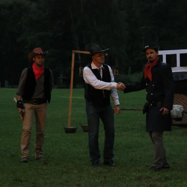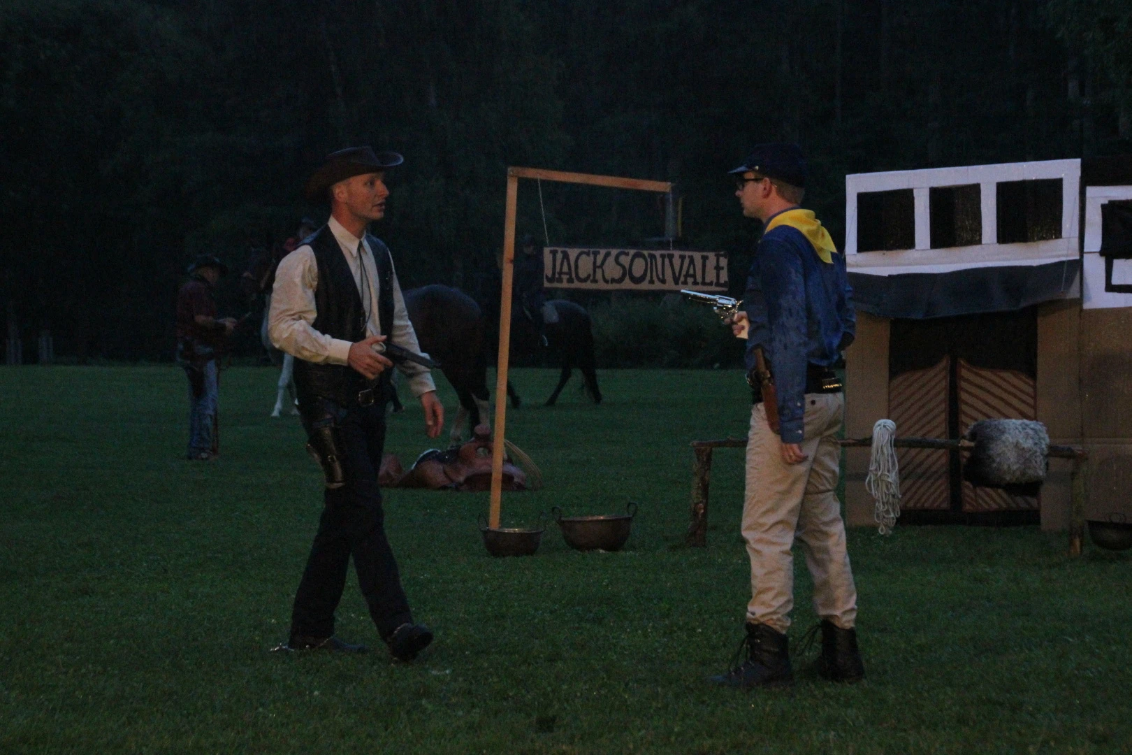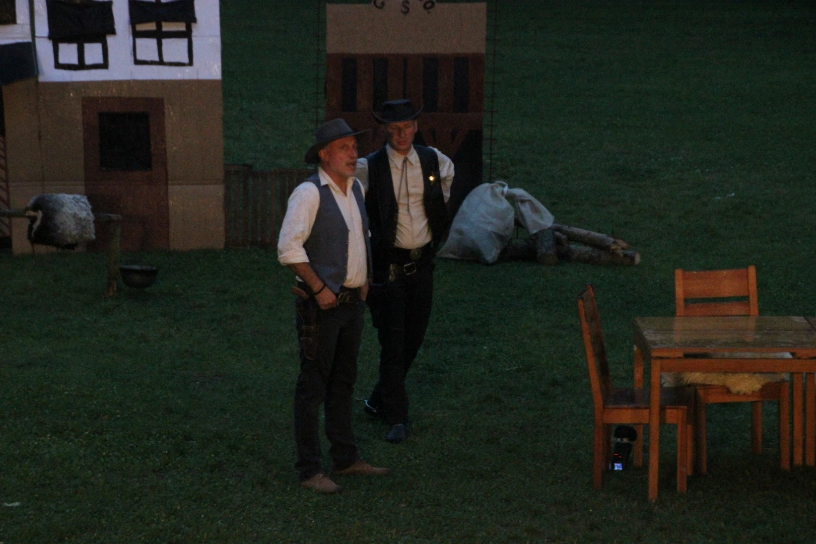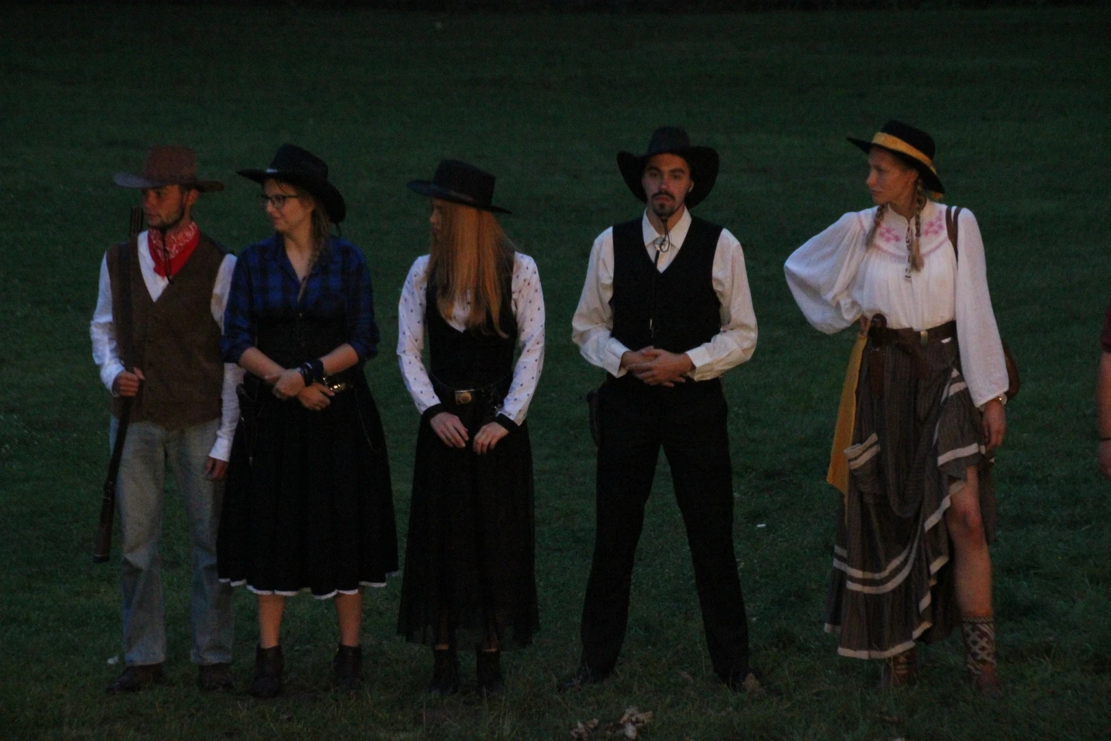 Večer jsme zahájili „celotáborovku“. No, zahájili…. Sotva jsme se s dětmi sešli na „place“, nebe se zatáhlo a začalo jemně pršet. „To dáme! Děti mají pláštěnky a my nejsme z cukru!“, povzbuzujeme se navzájem. A tak děti koukají na čtyři překrásné koníky, na kterých nám kamarádi přijeli pomoci navodit tu správnou atmosféru, na moc pěkné kostýmy a do detailu připravené úvodní divadlo. Jenže ten nahoře, nebo kdo vlastně ovládá nebeský kohoutek, se rozhodl, že to chce víc deště…a ještě víc deště…až nám nezbylo, než lehce improvizovat a druhou půlku zahájení přeložit na pondělí.