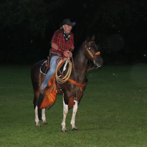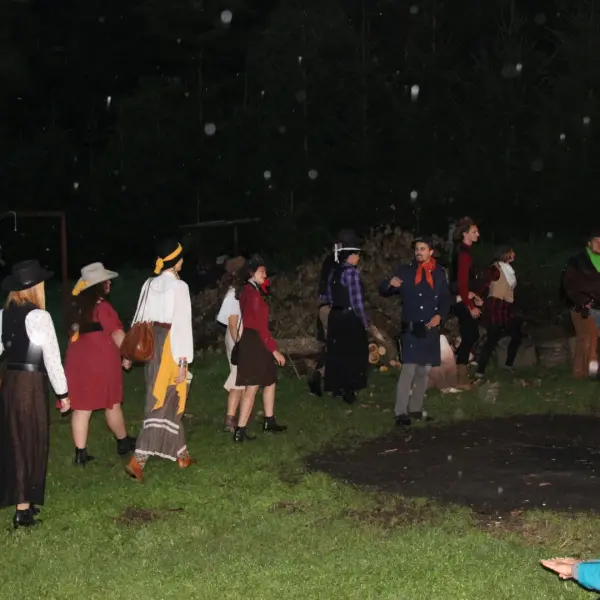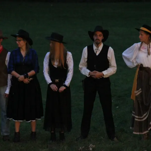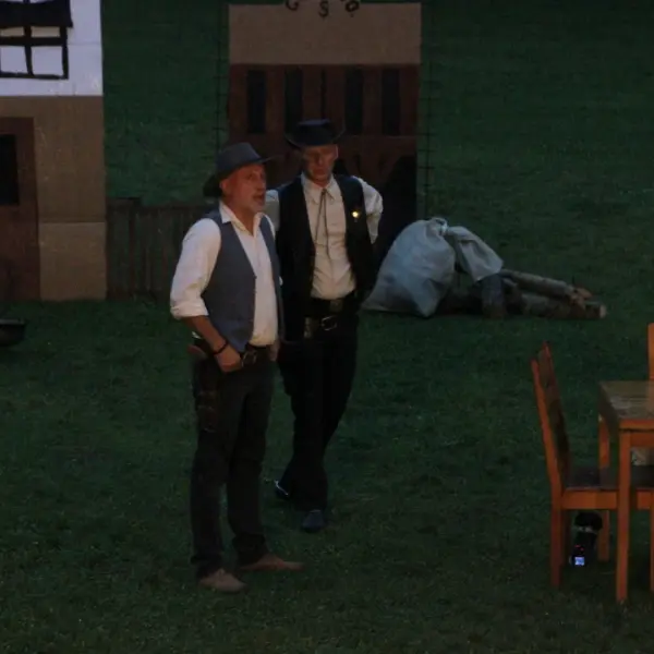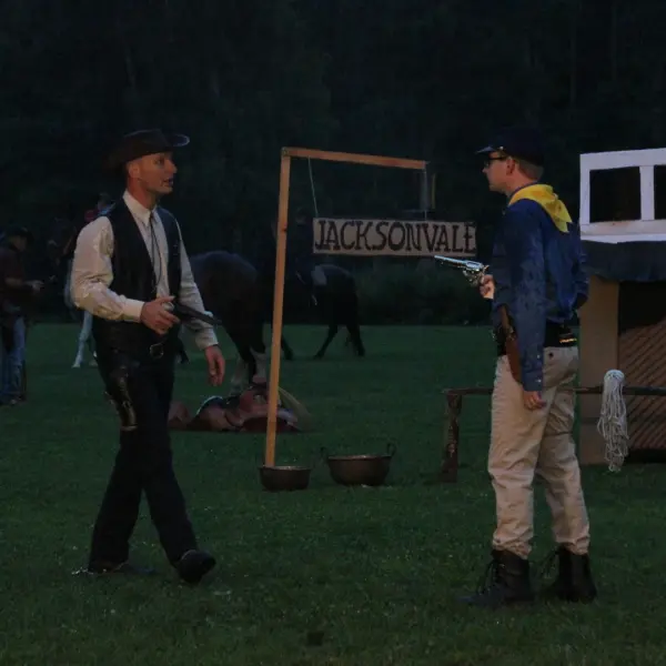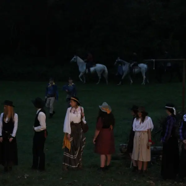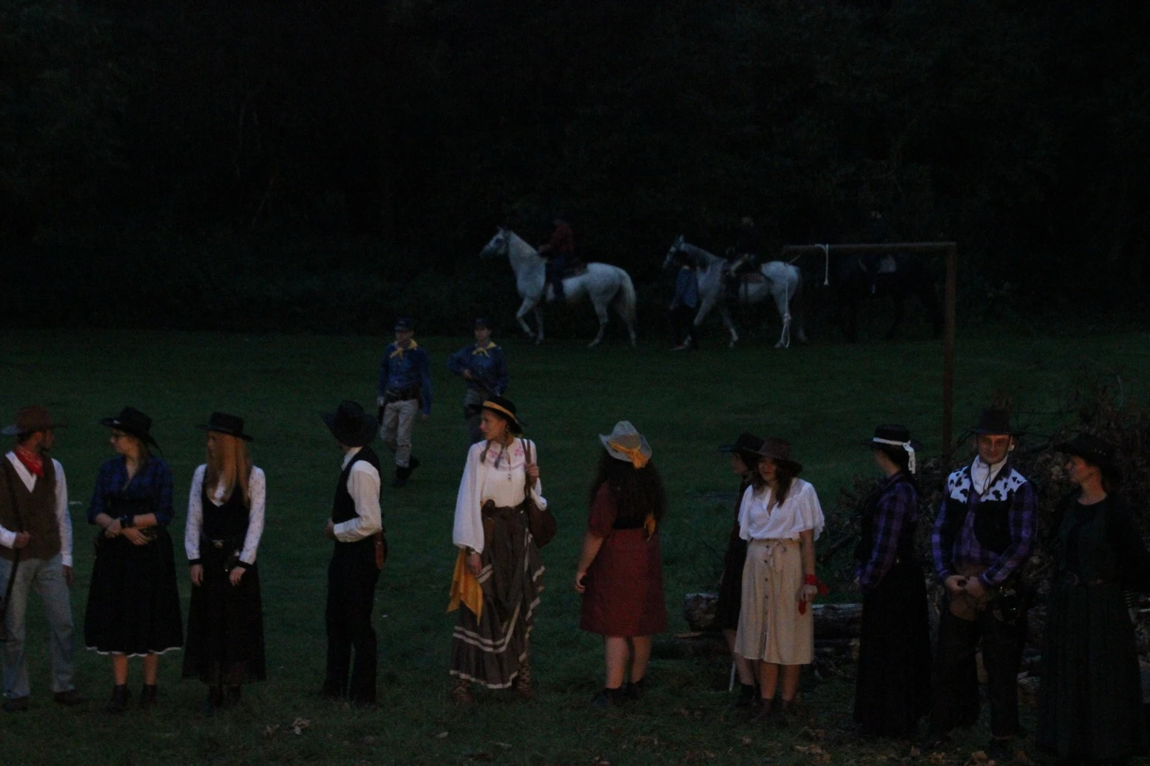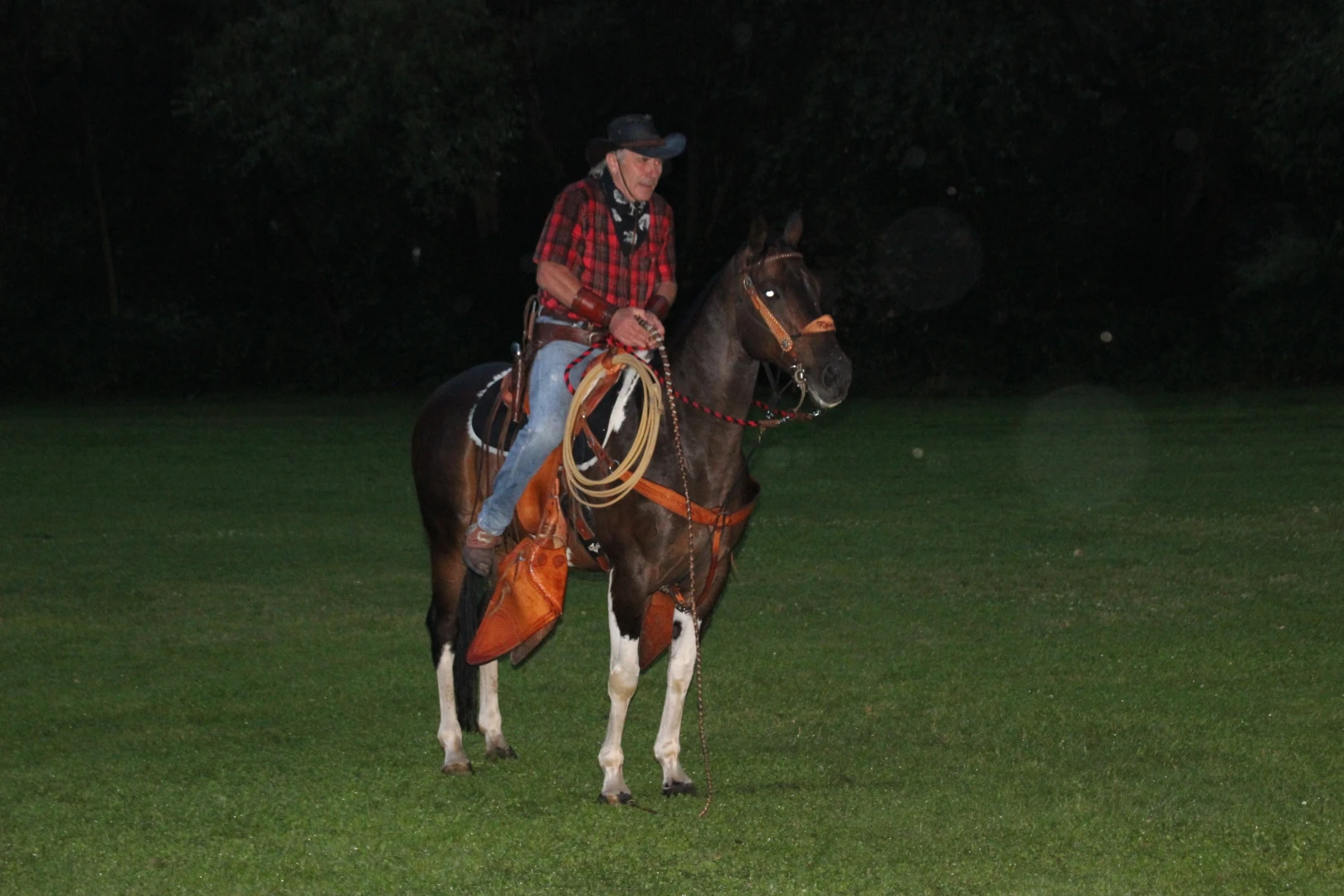 Večer jsme zahájili „celotáborovku“. No, zahájili…. Sotva jsme se s dětmi sešli na „place“, nebe se zatáhlo a začalo jemně pršet. „To dáme! Děti mají pláštěnky a my nejsme z cukru!“, povzbuzujeme se navzájem. A tak děti koukají na čtyři překrásné koníky, na kterých nám kamarádi přijeli pomoci navodit tu správnou atmosféru, na moc pěkné kostýmy a do detailu připravené úvodní divadlo. Jenže ten nahoře, nebo kdo vlastně ovládá nebeský kohoutek, se rozhodl, že to chce víc deště…a ještě víc deště…až nám nezbylo, než lehce improvizovat a druhou půlku zahájení přeložit na pondělí.