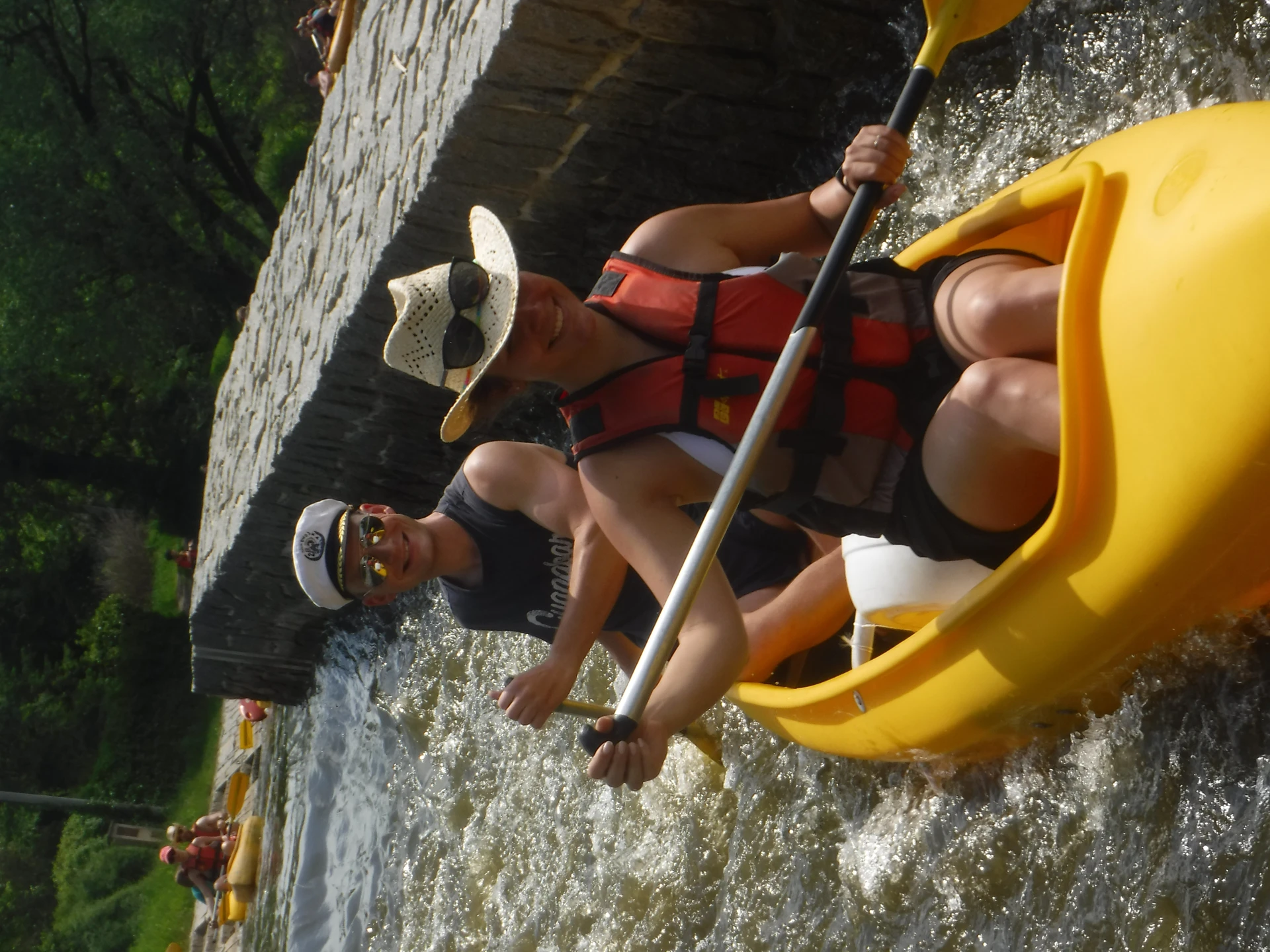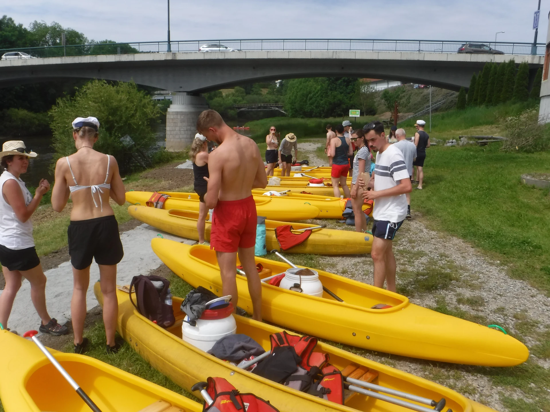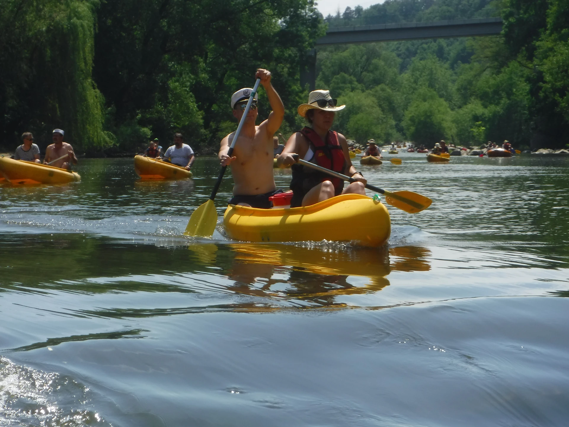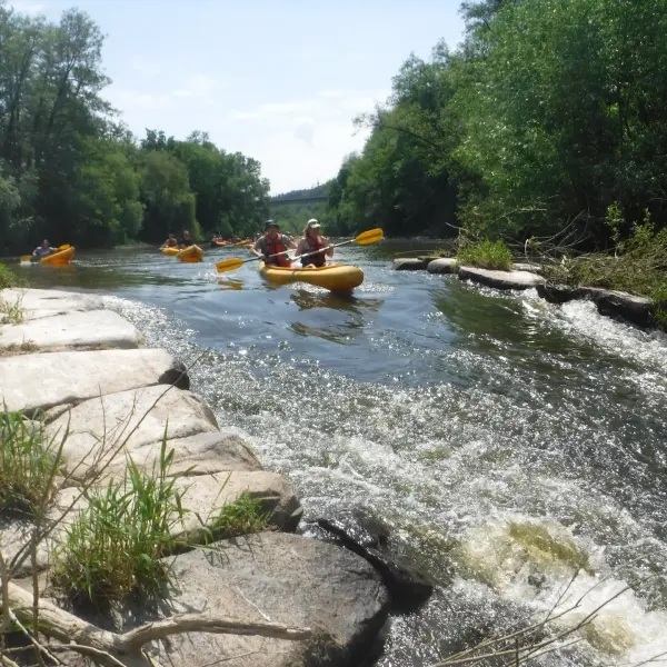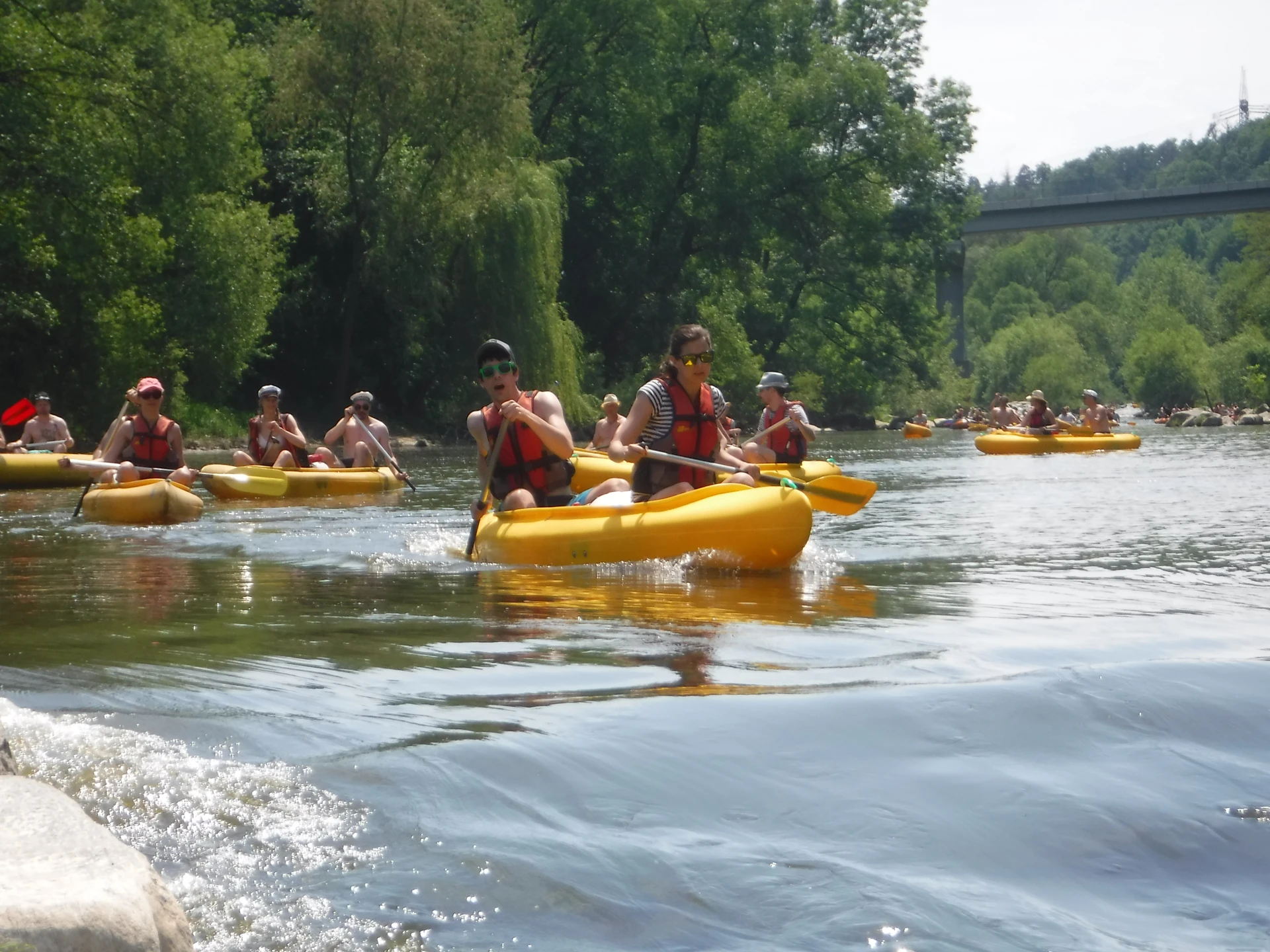 Přálo nám počasí i řeka sama. Zejména tím, že bylo slunečno a byl také dostatek vody, a tak jsme letos ani nedrhli o dno. Naopak! Jindy zdálky patrné kameny se letos ponořily těsně pod hladinu a v nejnevhodnějších okamžicích se nerozpakovaly některé z nás obrátit nedobrovolně dnem vzhůru… Nikde jinde, než mezi přáteli a kamarády, nenajdete více posměváčků, to si buďte jistí! Takže zatímco ze dna lodě lovíte mokrou housku a nacucané triko, dozvídáte se mnohé o vašem kormidelnickém stylu. Přitom na vodě každý ví, že za všechno zlé může jen a výhradně háček!