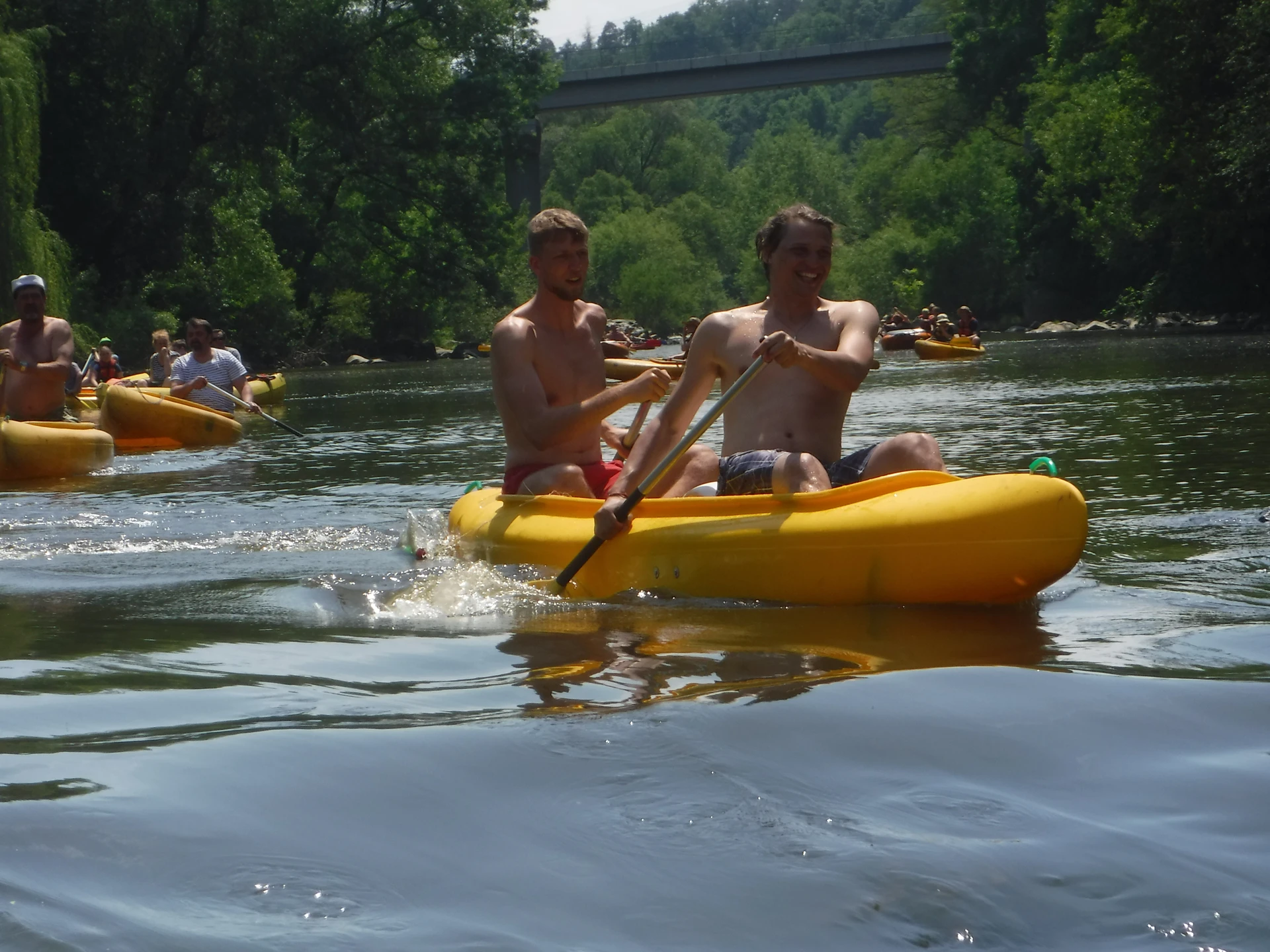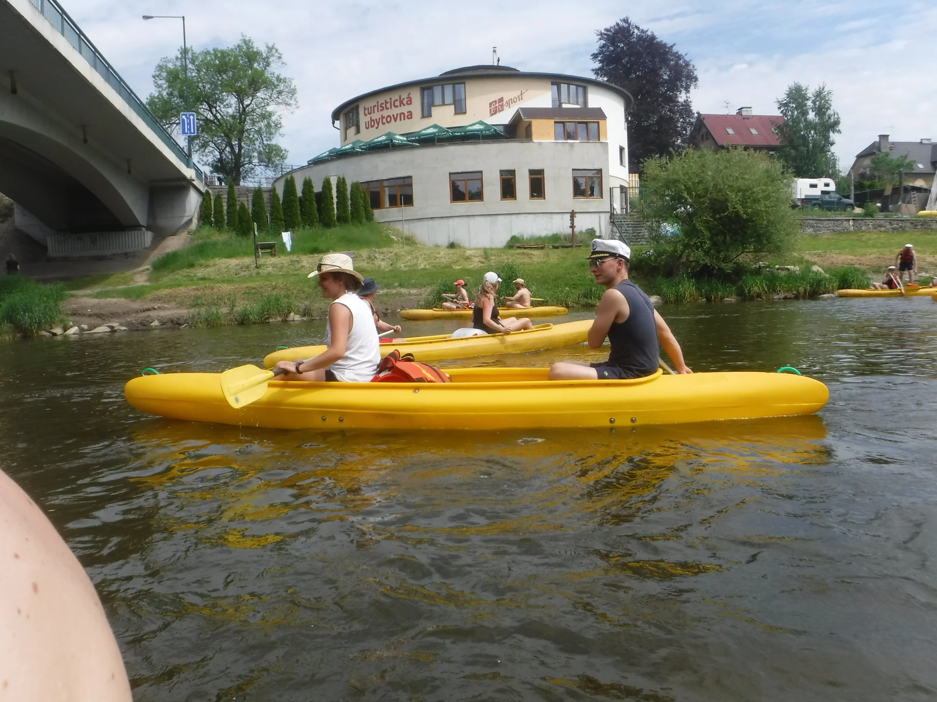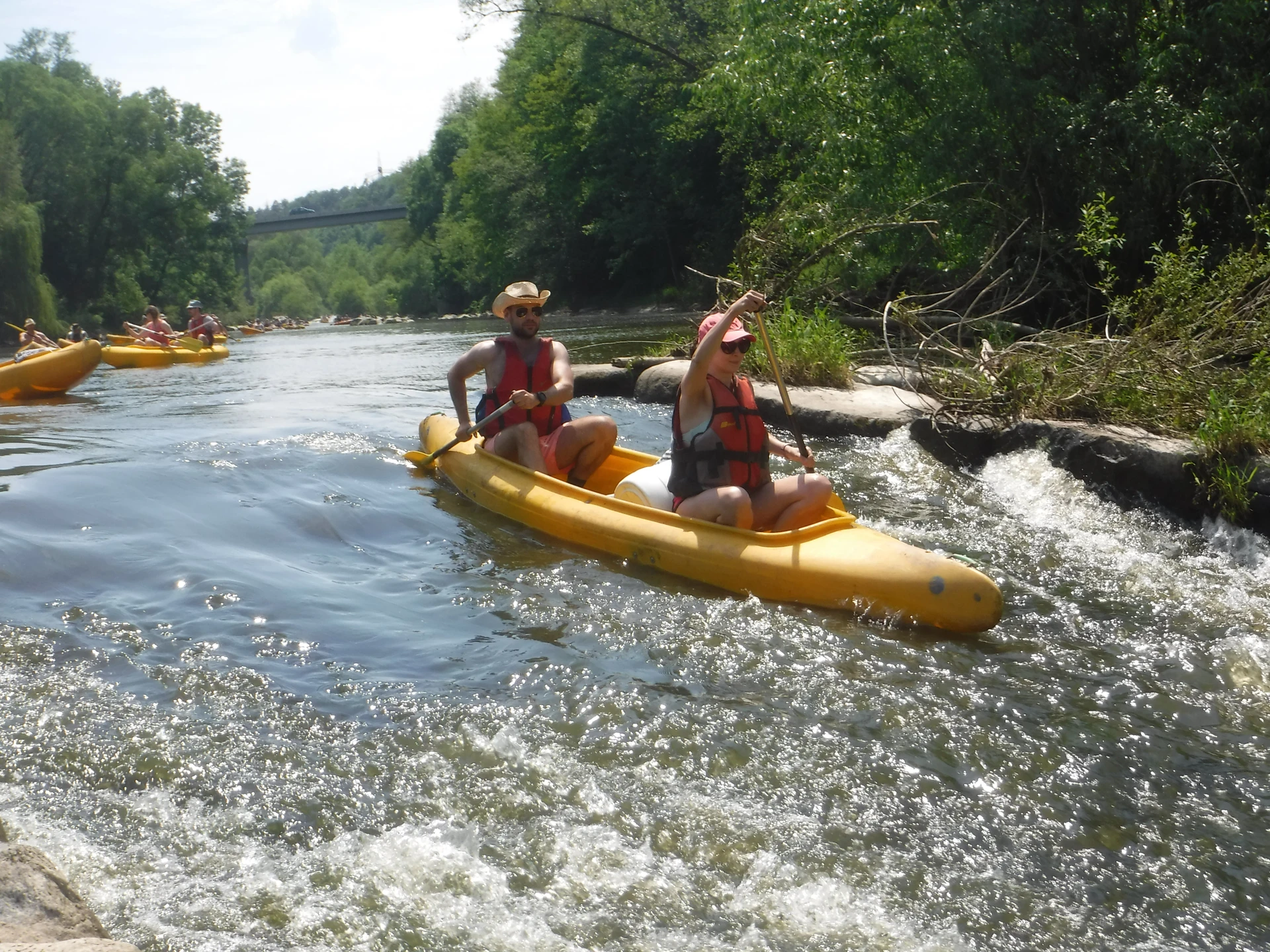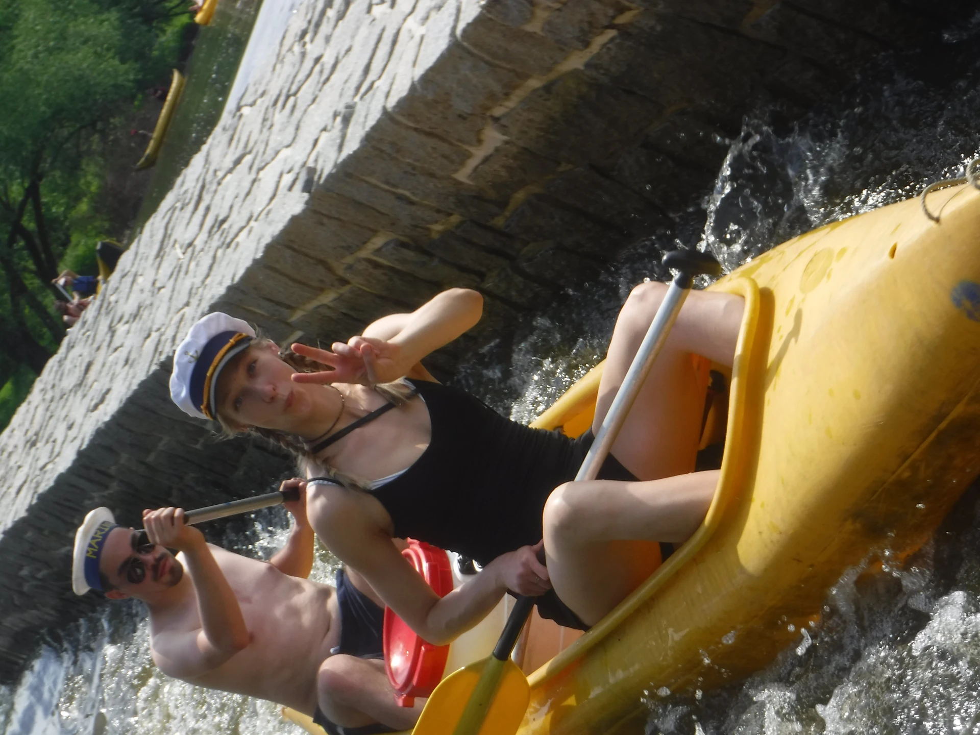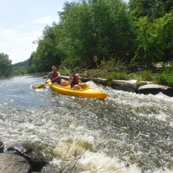 Přálo nám počasí i řeka sama. Zejména tím, že bylo slunečno a byl také dostatek vody, a tak jsme letos ani nedrhli o dno. Naopak! Jindy zdálky patrné kameny se letos ponořily těsně pod hladinu a v nejnevhodnějších okamžicích se nerozpakovaly některé z nás obrátit nedobrovolně dnem vzhůru… Nikde jinde, než mezi přáteli a kamarády, nenajdete více posměváčků, to si buďte jistí! Takže zatímco ze dna lodě lovíte mokrou housku a nacucané triko, dozvídáte se mnohé o vašem kormidelnickém stylu. Přitom na vodě každý ví, že za všechno zlé může jen a výhradně háček!