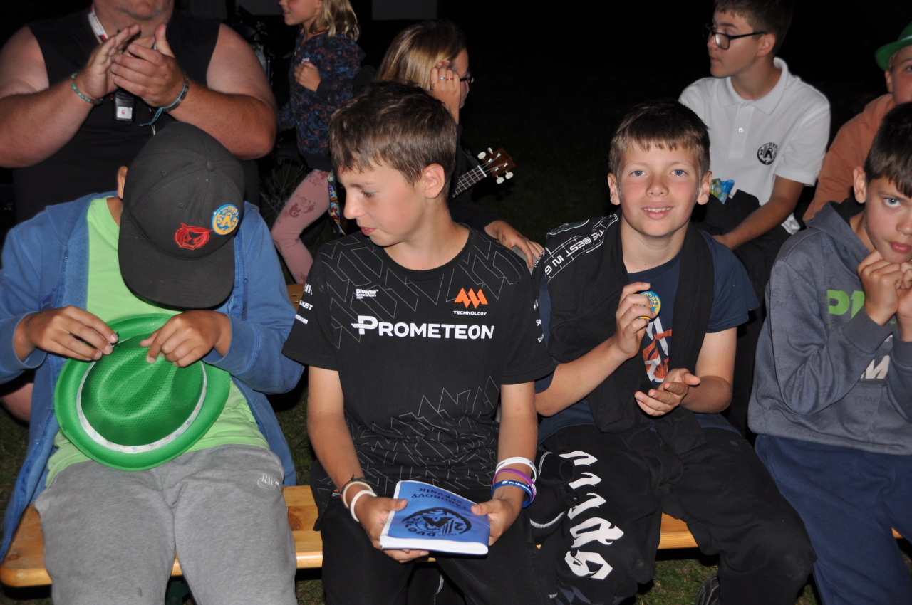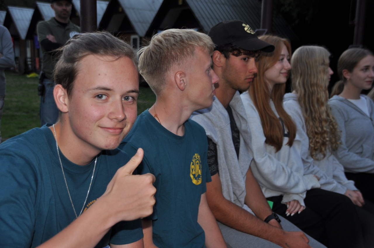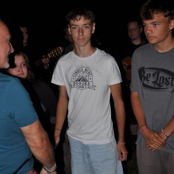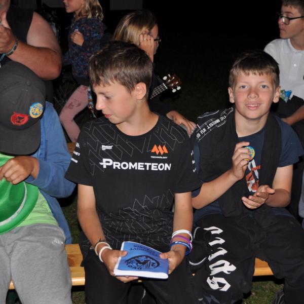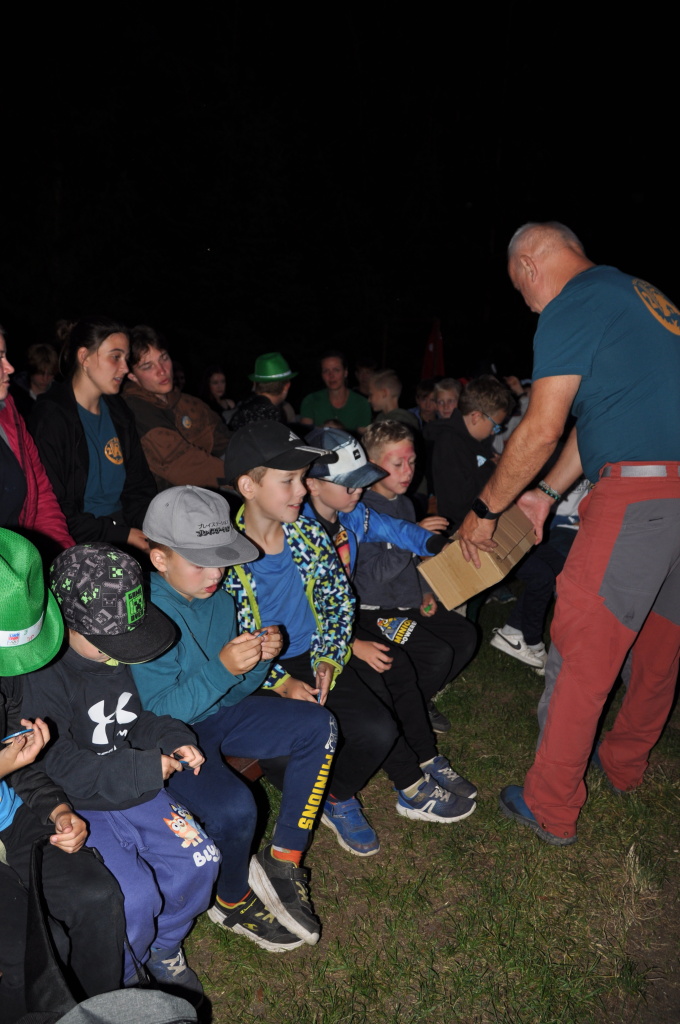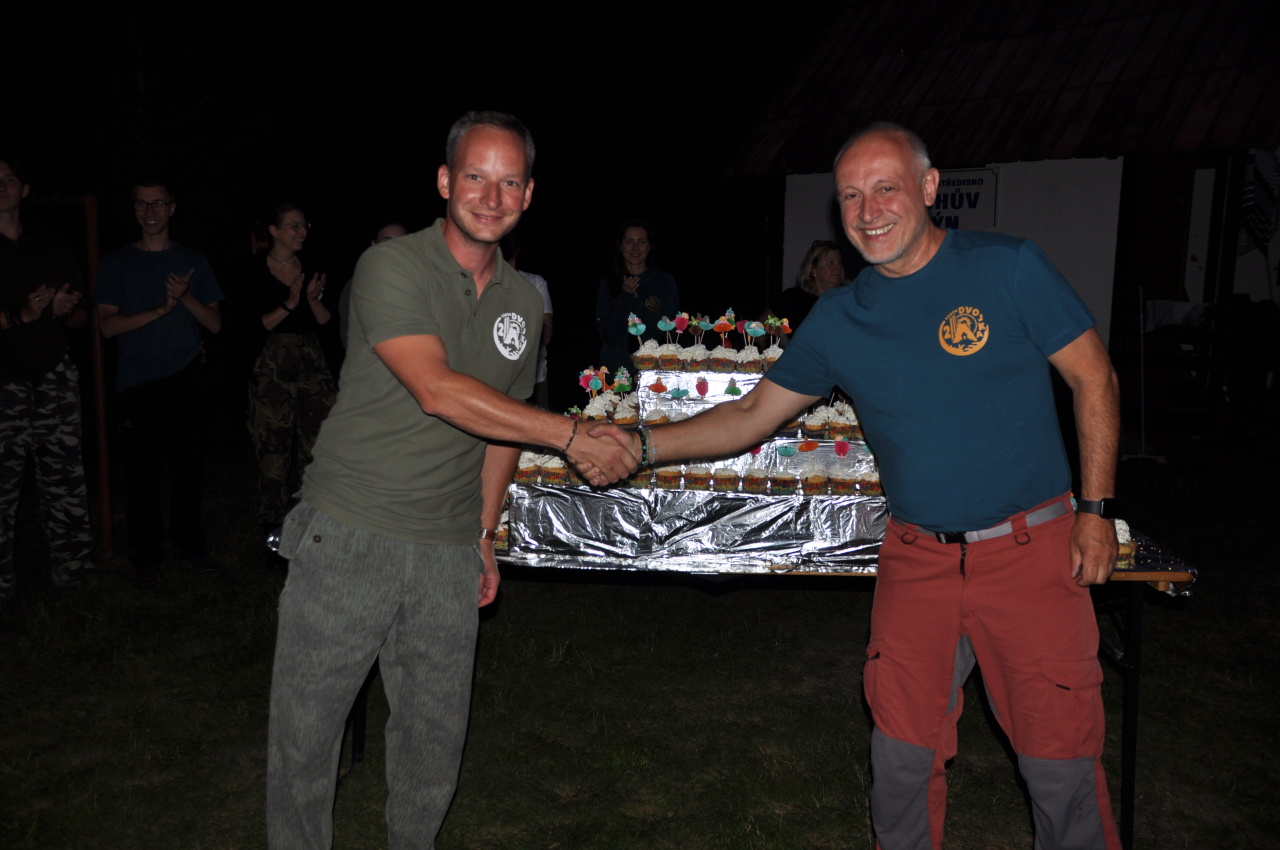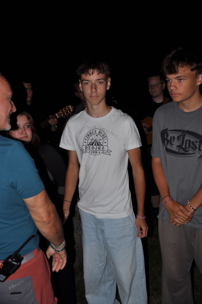 Večer jsme si udělali poslední táborák, zazpívali si "ty naše" a vyhlásili jsme nejlepší táborníky roku 2025. Pak jsme se předáním táborových triček rozloučili s našimi nejstaršími kamarády z devátého a desátého oddílu, kteří po prázdninách nastupují na střední školu a přichází tak o možnost v dalším roce jet jako táborník s námi na Dvojku. Na druhou stranu se jim otevírá možnost užít si náš tábor v pozici juniorů, tak uvidíme, kolik z nich tuto exkluzivní možnost v příštím roce využije.