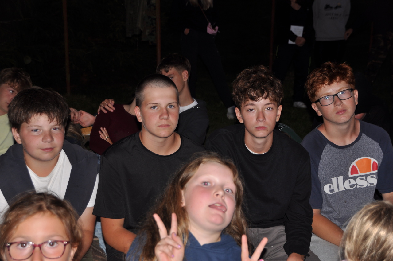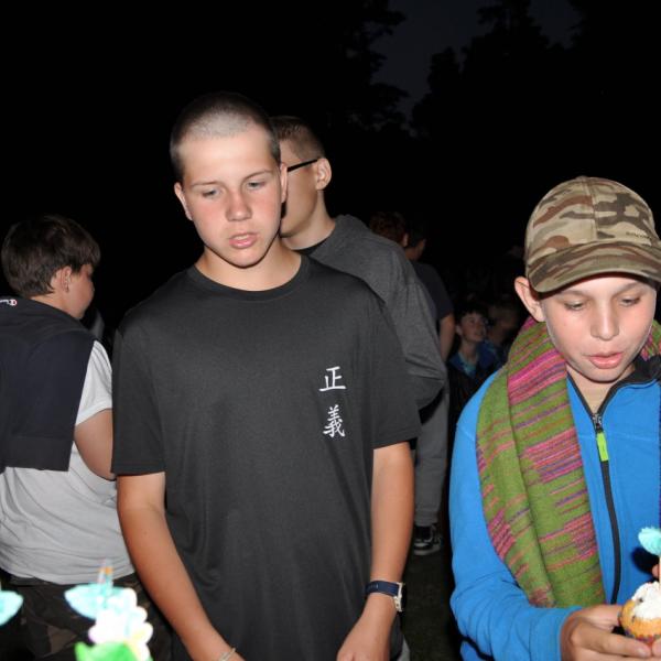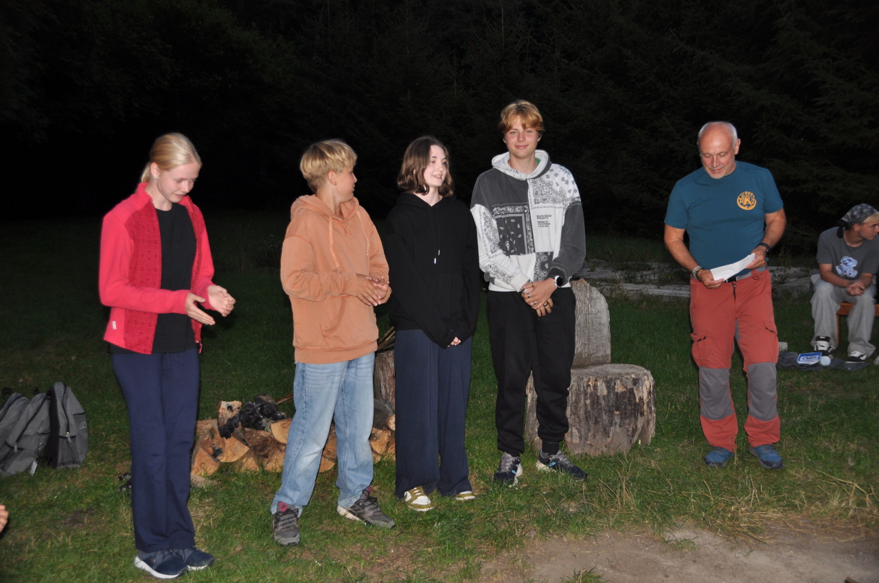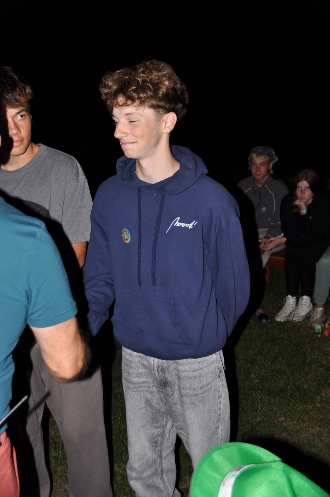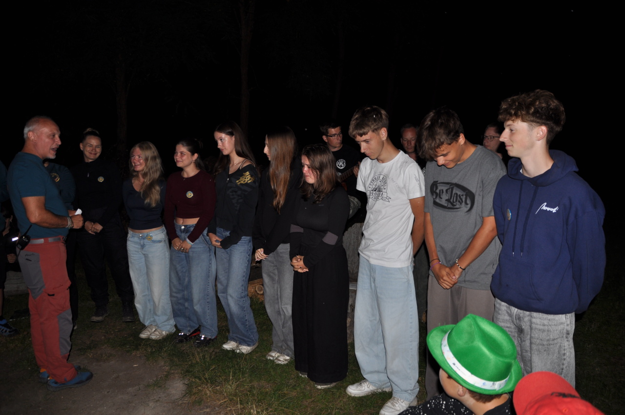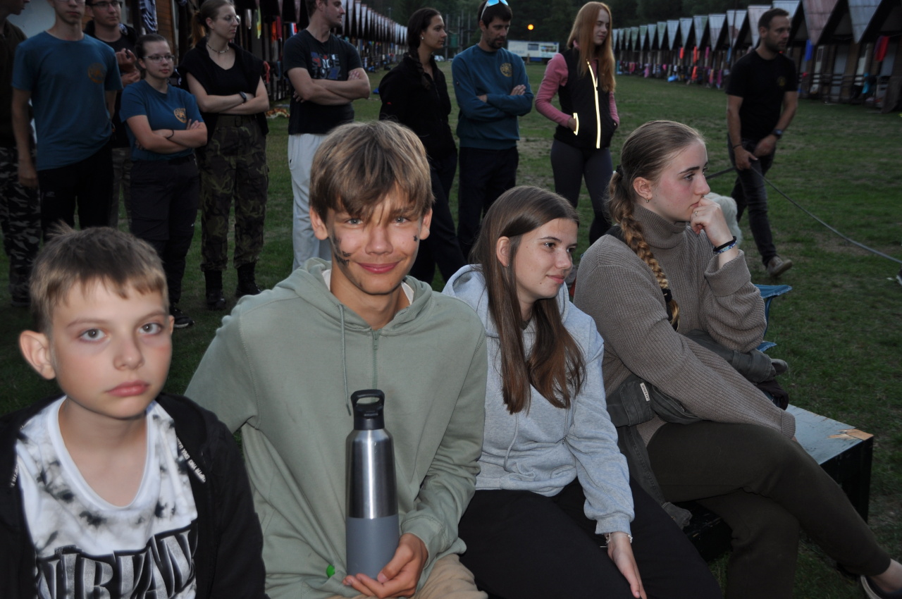 Večer jsme si udělali poslední táborák, zazpívali si "ty naše" a vyhlásili jsme nejlepší táborníky roku 2025. Pak jsme se předáním táborových triček rozloučili s našimi nejstaršími kamarády z devátého a desátého oddílu, kteří po prázdninách nastupují na střední školu a přichází tak o možnost v dalším roce jet jako táborník s námi na Dvojku. Na druhou stranu se jim otevírá možnost užít si náš tábor v pozici juniorů, tak uvidíme, kolik z nich tuto exkluzivní možnost v příštím roce využije.