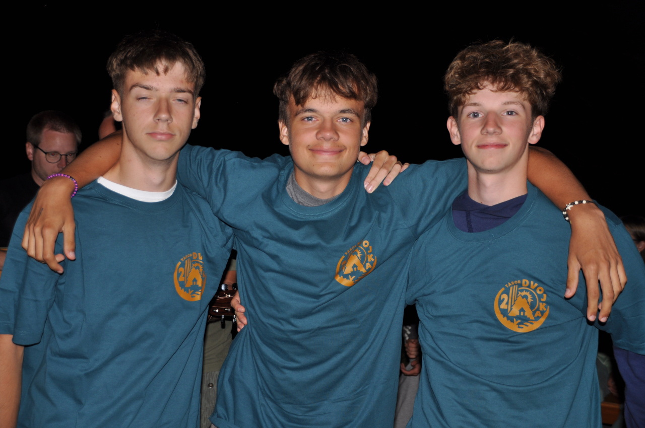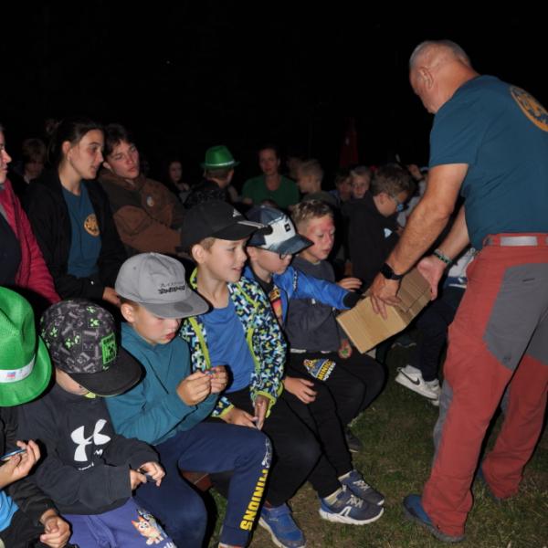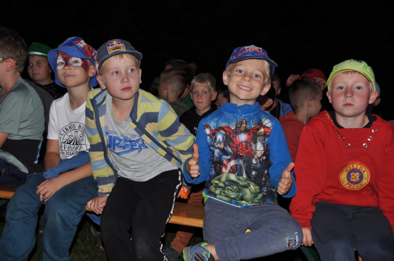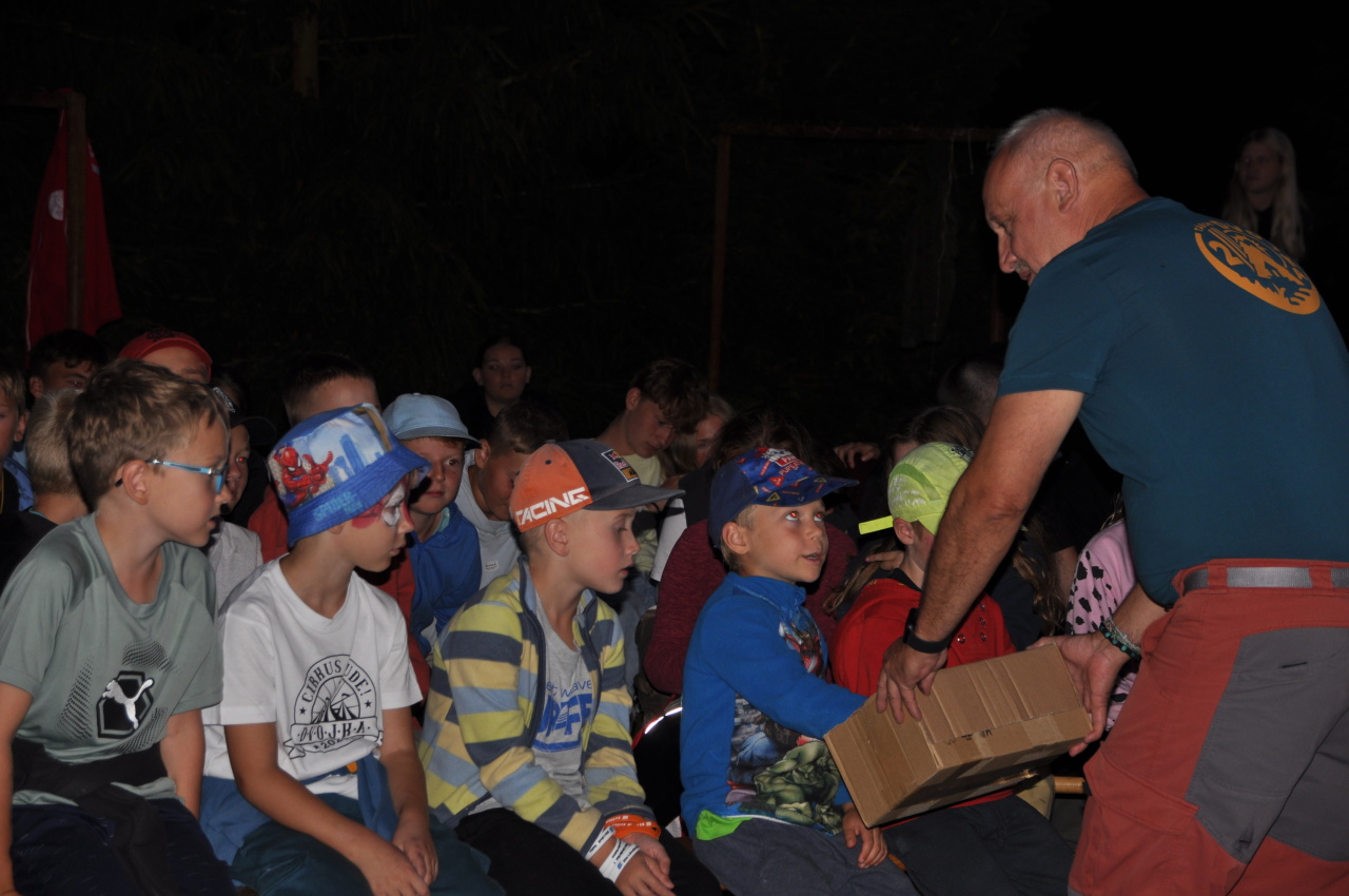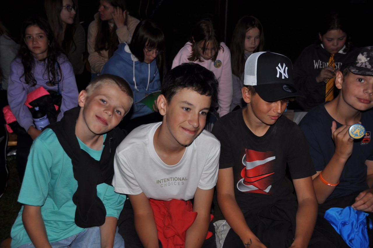 Večer jsme si udělali poslední táborák, zazpívali si "ty naše" a vyhlásili jsme nejlepší táborníky roku 2025. Pak jsme se předáním táborových triček rozloučili s našimi nejstaršími kamarády z devátého a desátého oddílu, kteří po prázdninách nastupují na střední školu a přichází tak o možnost v dalším roce jet jako táborník s námi na Dvojku. Na druhou stranu se jim otevírá možnost užít si náš tábor v pozici juniorů, tak uvidíme, kolik z nich tuto exkluzivní možnost v příštím roce využije.