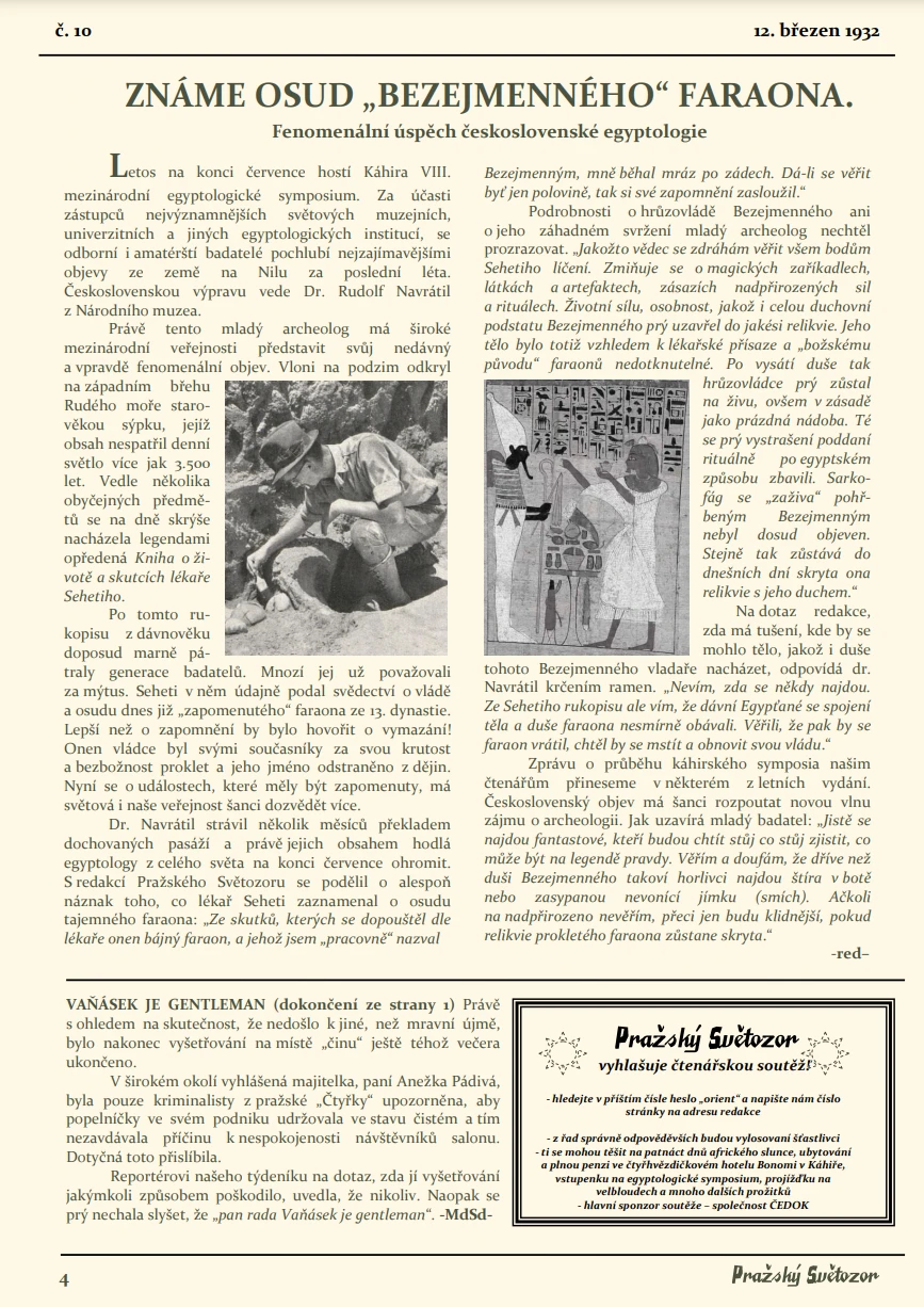 ...prý na něj nápad na dobrodružství doslova vykoukl při bádání ve starých tiscích v Národní knihovně. Neváhal, a dotyčnou inspirativní stránku z devadesátiletého (dnes již nevycházejícího) týdeníku - Pražský Světozor - pro nás okopíroval. Prý, že sám by lépe nedokázal vystihnout atmosféru našeho plánovaného dobrodružství...