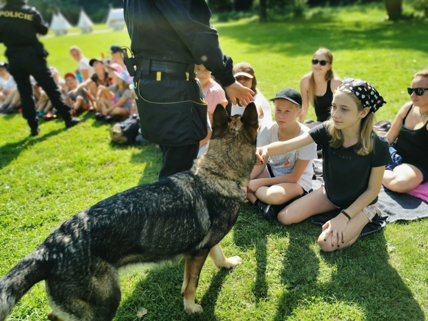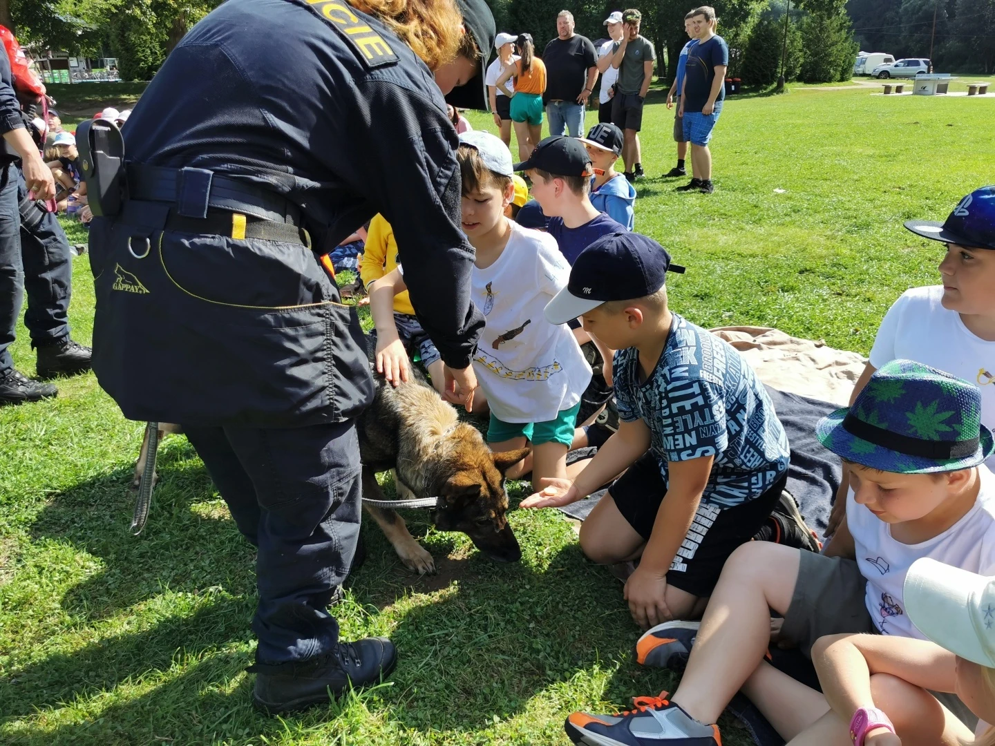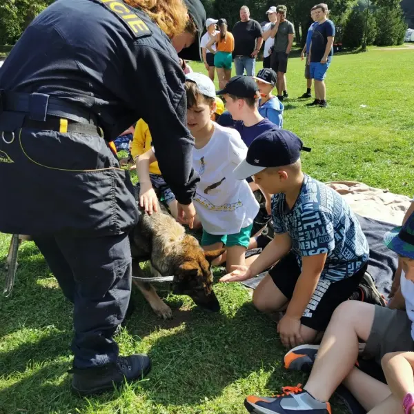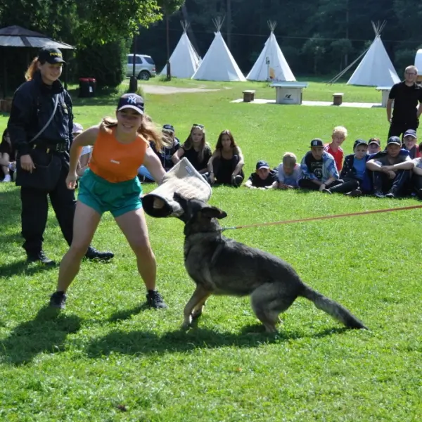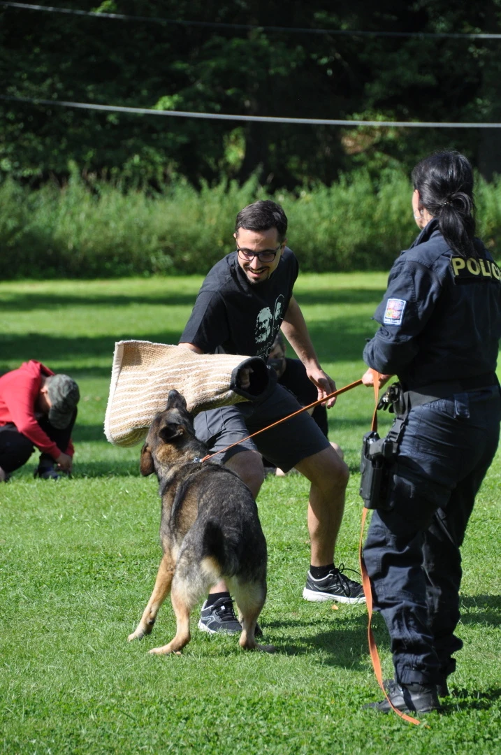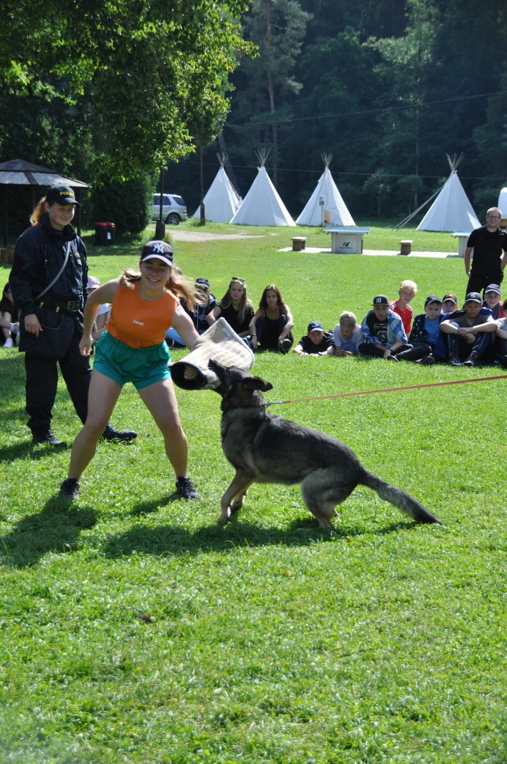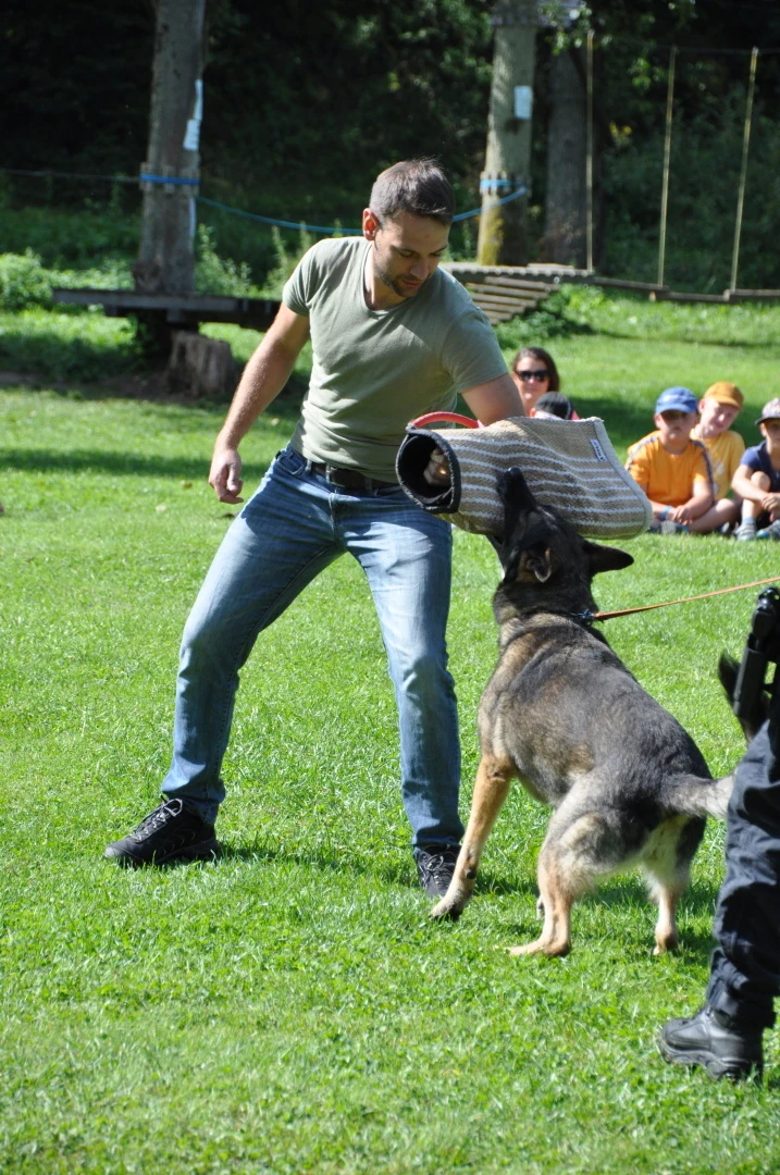 Dopoledne to byla doslova psina. Tři fenky, z toho jedno ještě úplně rozlítané osmiměsíční štěně, nám ukázaly, že se dovedou s nejedním živlem dobře poradit. Došlo na odzbrojování, vyhledávání předmětů a lidí a samozřejmě i na obligatorní rukáv. Holky psovodky (existuje tohle slovo?) měly psy tak zvládnuté, že dovolily i některým z nás dospělých Dvojkařů nechat se za rukáv chytit. A je to věc, když na vás běží pětatřicet kilo zubů! Děti se samozřejmě také domáhaly aktivní účasti na hryzavé zábavě, ale my jsme byli neoblomní. Stačí, že je hryžou komáři a ovádi. Na závěr si mohly děti dva pejsky pomazlit. Krmení piškoty a kontakt na blízko byl pro ně jednoznačně zážitek, když se ukázalo, že fenky jsou „mimo službu“ neuvěřitelně přítulné a kamarádské.