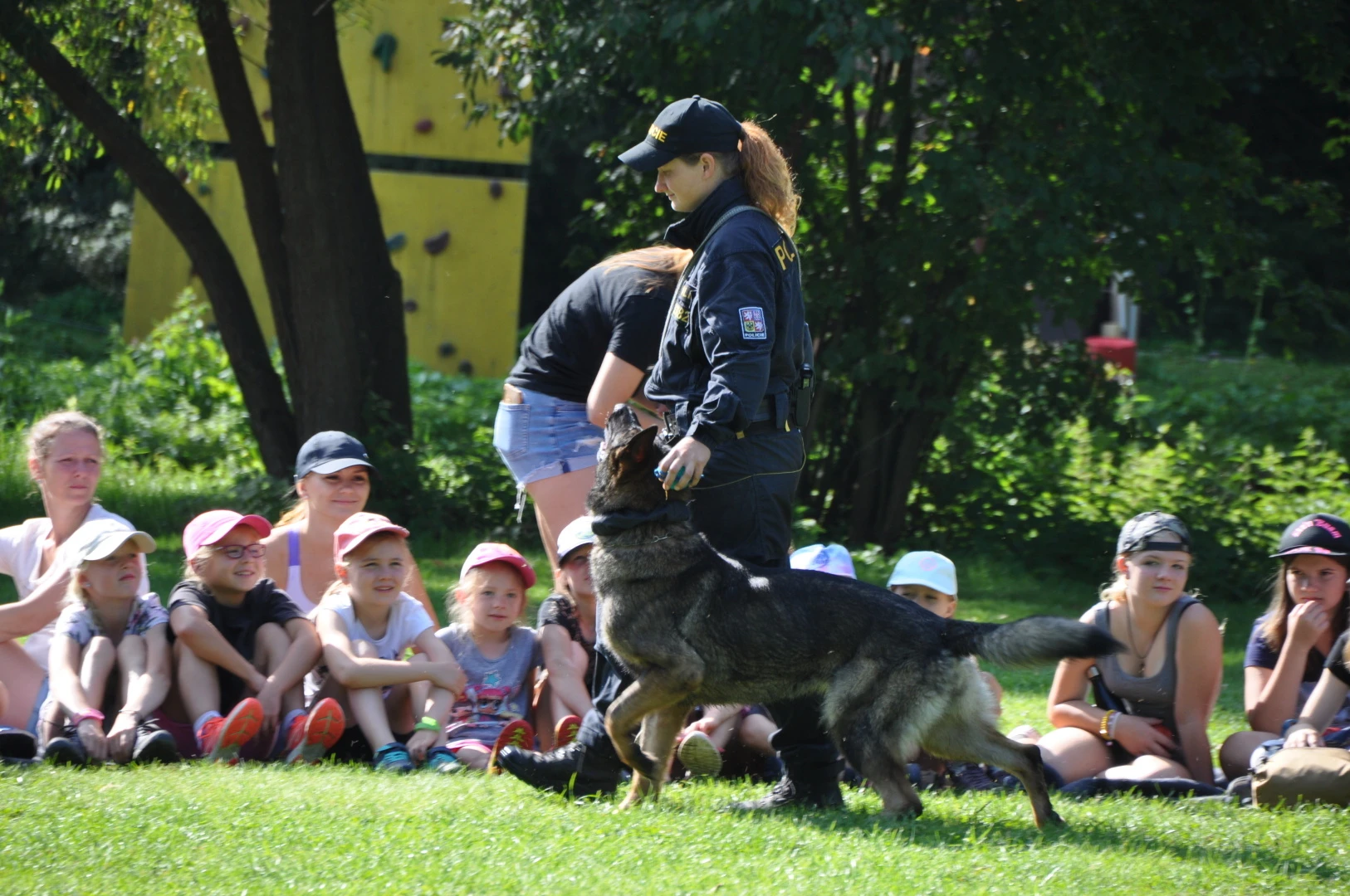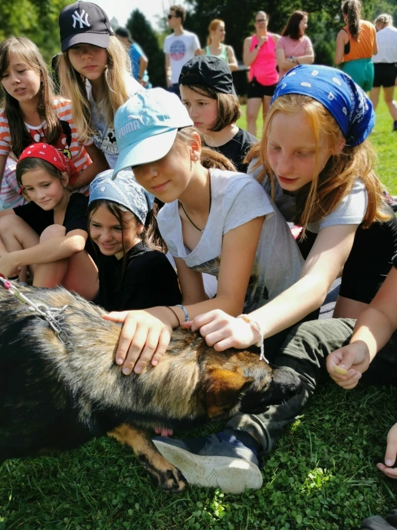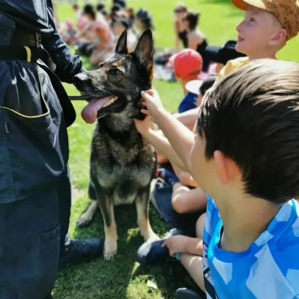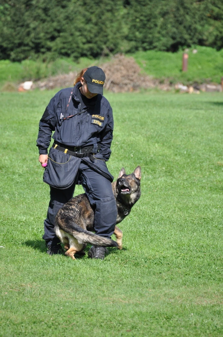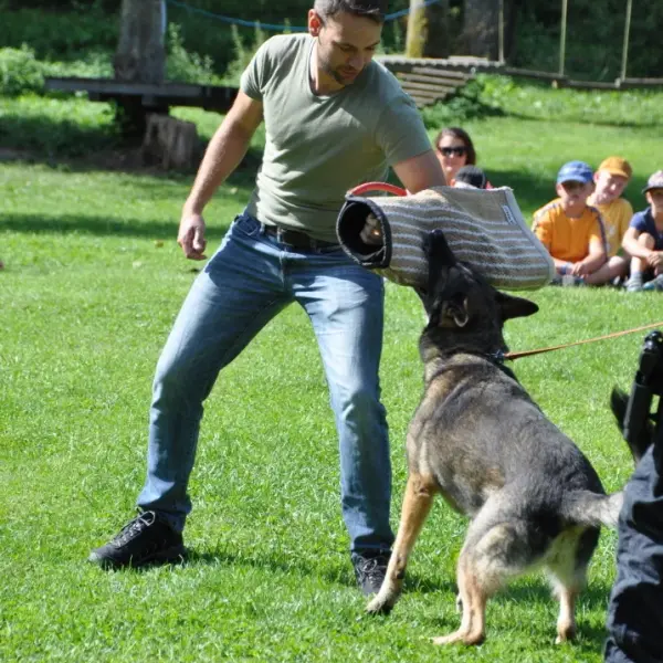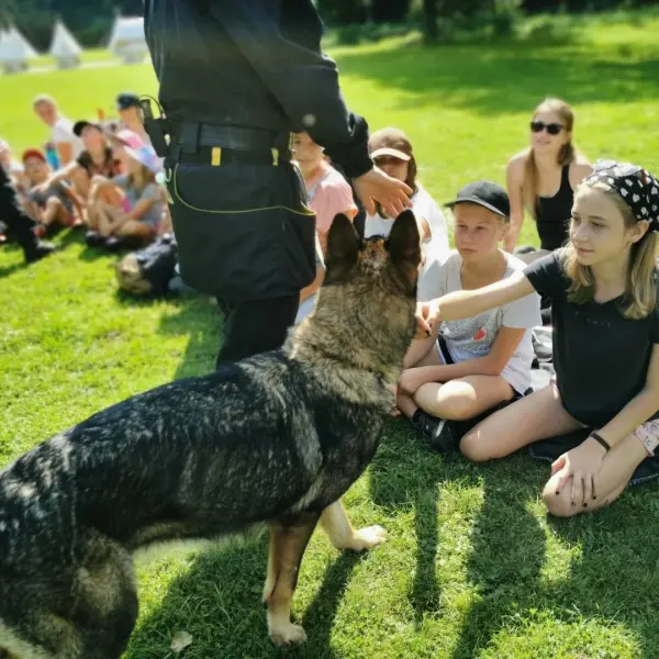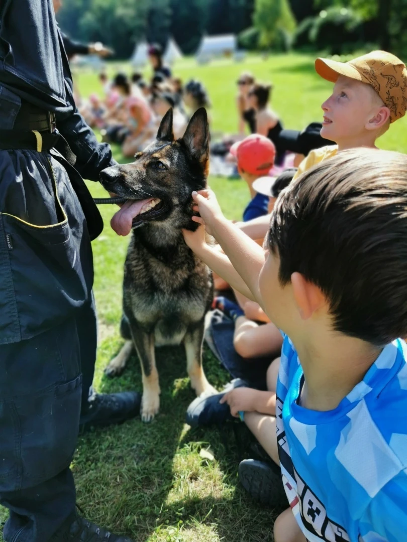 Dopoledne to byla doslova psina. Tři fenky, z toho jedno ještě úplně rozlítané osmiměsíční štěně, nám ukázaly, že se dovedou s nejedním živlem dobře poradit. Došlo na odzbrojování, vyhledávání předmětů a lidí a samozřejmě i na obligatorní rukáv. Holky psovodky (existuje tohle slovo?) měly psy tak zvládnuté, že dovolily i některým z nás dospělých Dvojkařů nechat se za rukáv chytit. A je to věc, když na vás běží pětatřicet kilo zubů! Děti se samozřejmě také domáhaly aktivní účasti na hryzavé zábavě, ale my jsme byli neoblomní. Stačí, že je hryžou komáři a ovádi. Na závěr si mohly děti dva pejsky pomazlit. Krmení piškoty a kontakt na blízko byl pro ně jednoznačně zážitek, když se ukázalo, že fenky jsou „mimo službu“ neuvěřitelně přítulné a kamarádské.