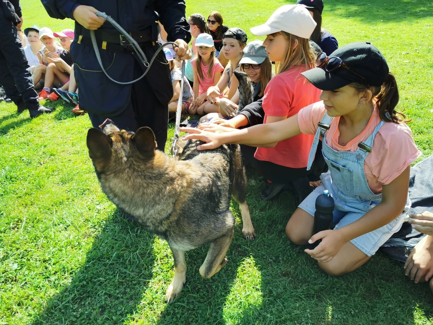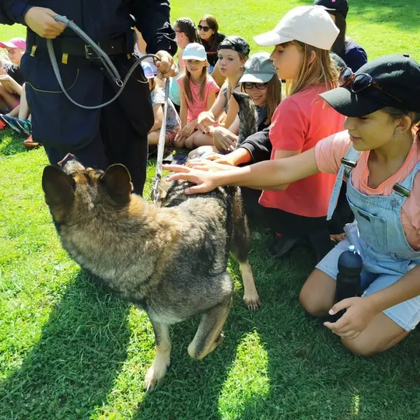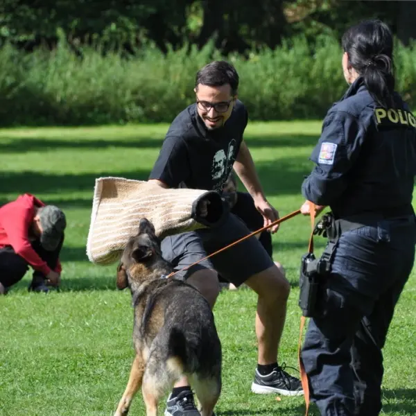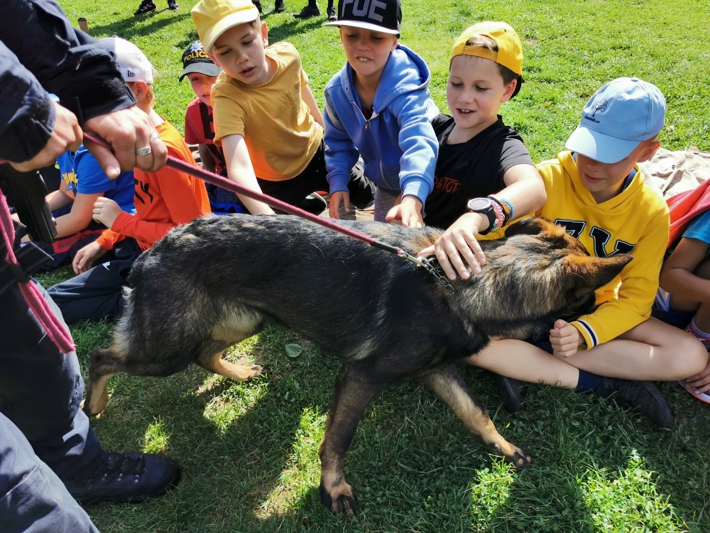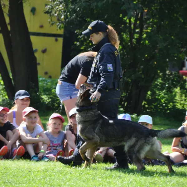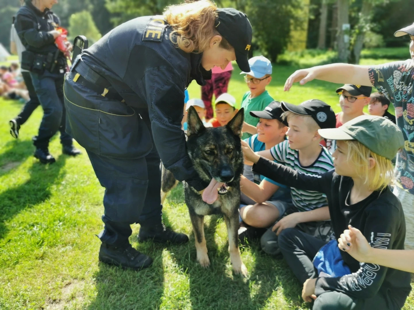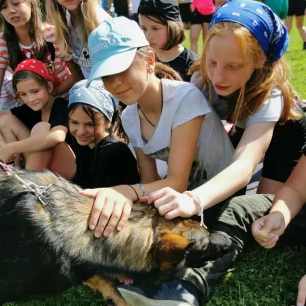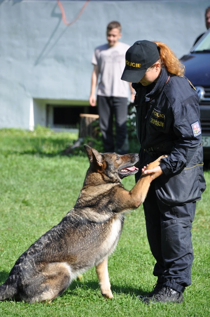 Dopoledne to byla doslova psina. Tři fenky, z toho jedno ještě úplně rozlítané osmiměsíční štěně, nám ukázaly, že se dovedou s nejedním živlem dobře poradit. Došlo na odzbrojování, vyhledávání předmětů a lidí a samozřejmě i na obligatorní rukáv. Holky psovodky (existuje tohle slovo?) měly psy tak zvládnuté, že dovolily i některým z nás dospělých Dvojkařů nechat se za rukáv chytit. A je to věc, když na vás běží pětatřicet kilo zubů! Děti se samozřejmě také domáhaly aktivní účasti na hryzavé zábavě, ale my jsme byli neoblomní. Stačí, že je hryžou komáři a ovádi. Na závěr si mohly děti dva pejsky pomazlit. Krmení piškoty a kontakt na blízko byl pro ně jednoznačně zážitek, když se ukázalo, že fenky jsou „mimo službu“ neuvěřitelně přítulné a kamarádské.