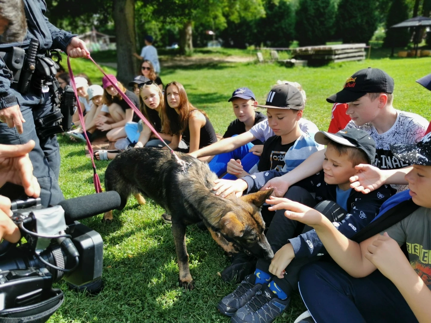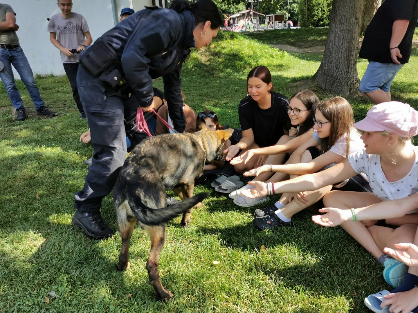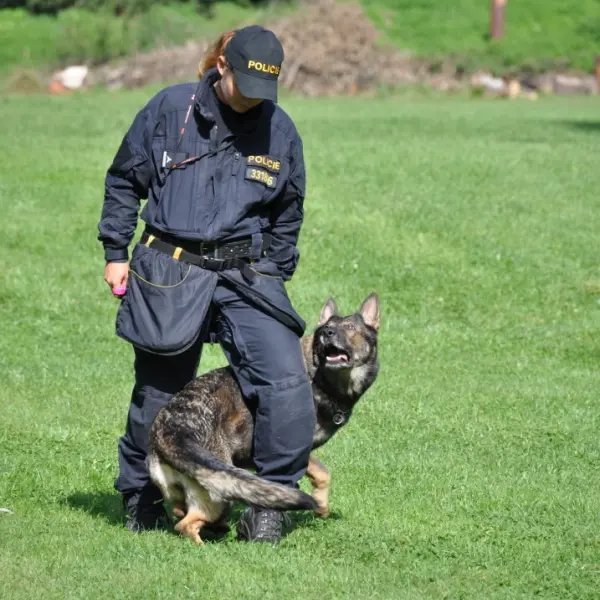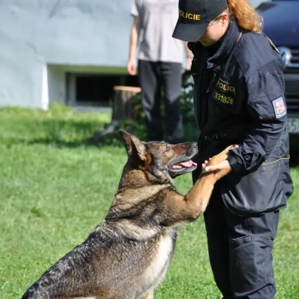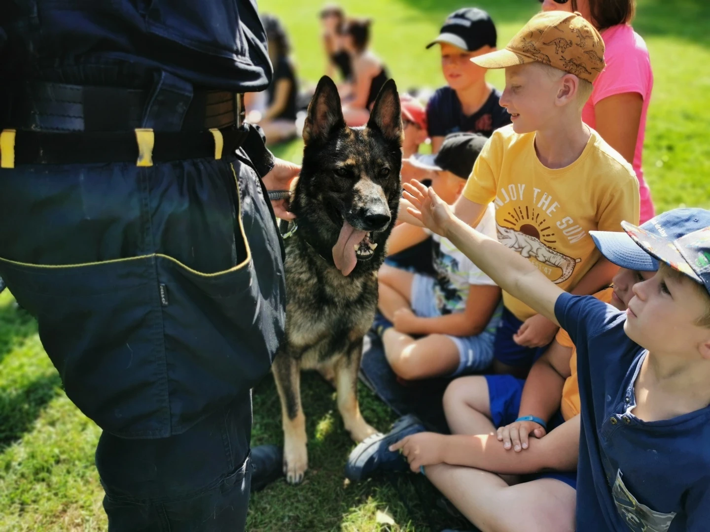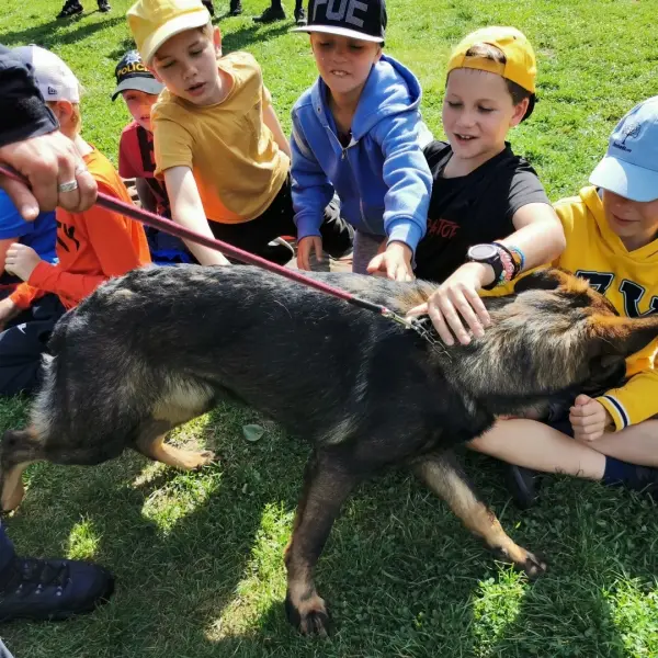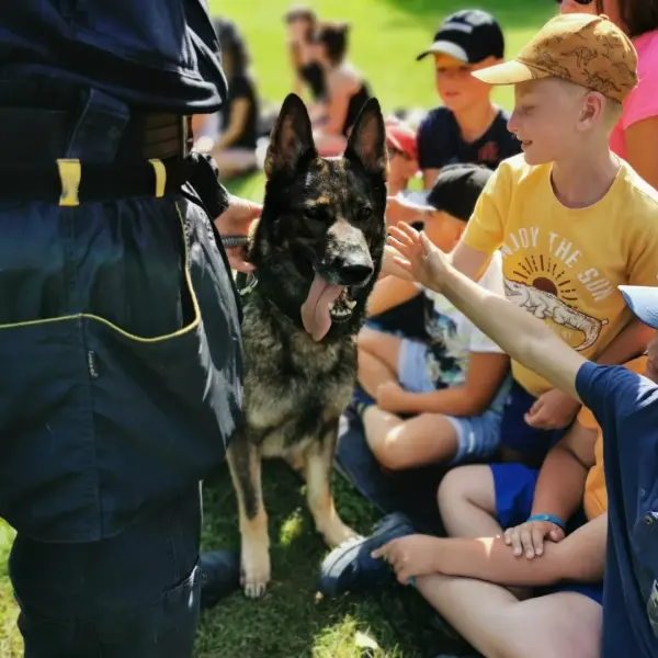 Dopoledne to byla doslova psina. Tři fenky, z toho jedno ještě úplně rozlítané osmiměsíční štěně, nám ukázaly, že se dovedou s nejedním živlem dobře poradit. Došlo na odzbrojování, vyhledávání předmětů a lidí a samozřejmě i na obligatorní rukáv. Holky psovodky (existuje tohle slovo?) měly psy tak zvládnuté, že dovolily i některým z nás dospělých Dvojkařů nechat se za rukáv chytit. A je to věc, když na vás běží pětatřicet kilo zubů! Děti se samozřejmě také domáhaly aktivní účasti na hryzavé zábavě, ale my jsme byli neoblomní. Stačí, že je hryžou komáři a ovádi. Na závěr si mohly děti dva pejsky pomazlit. Krmení piškoty a kontakt na blízko byl pro ně jednoznačně zážitek, když se ukázalo, že fenky jsou „mimo službu“ neuvěřitelně přítulné a kamarádské.