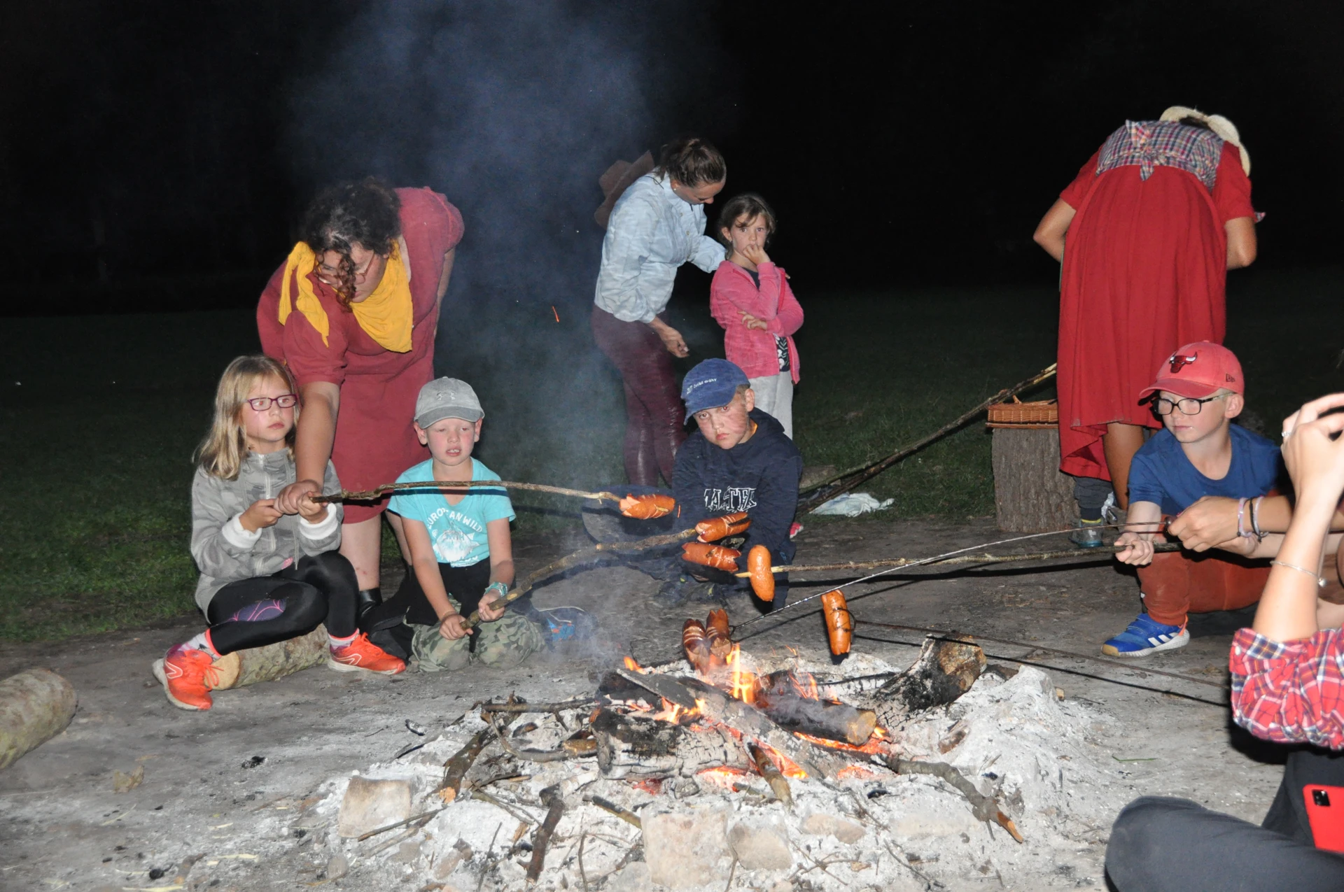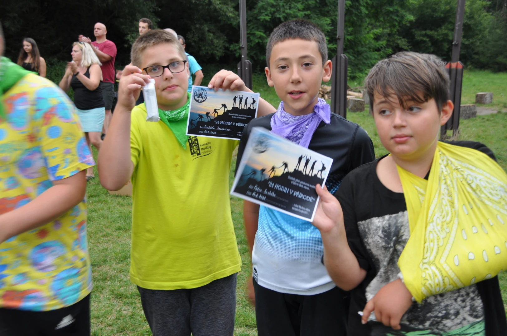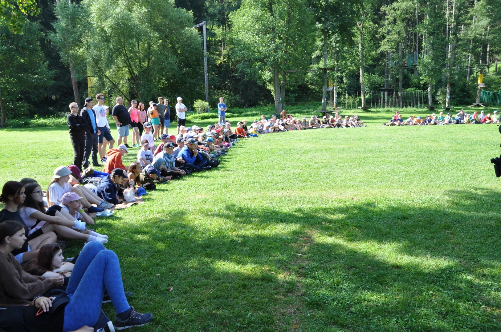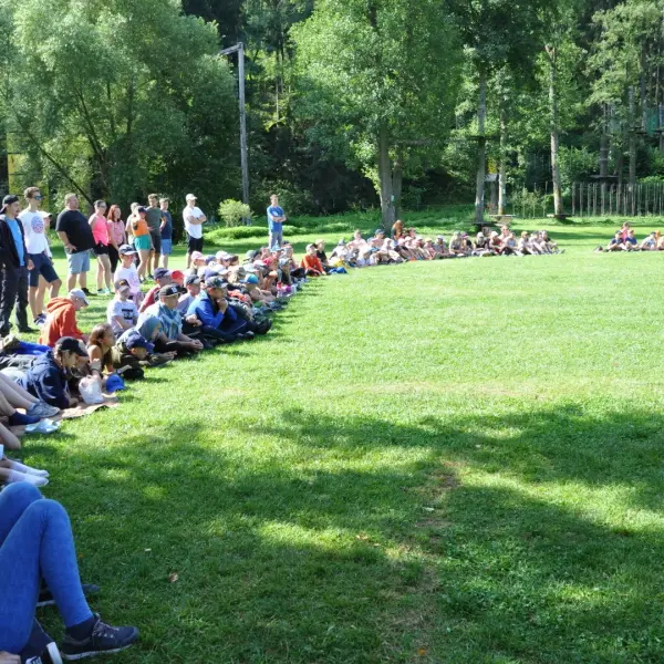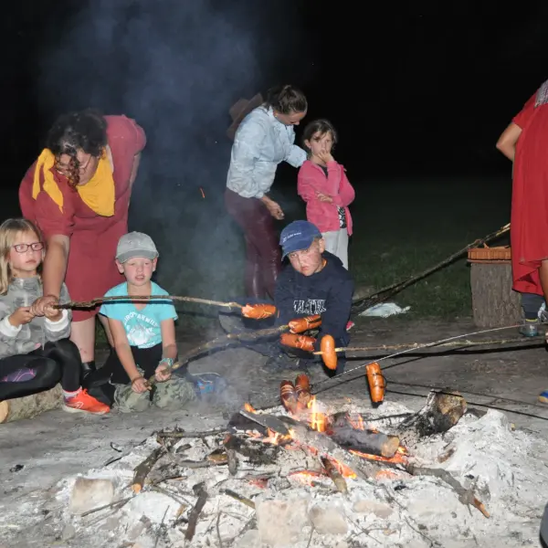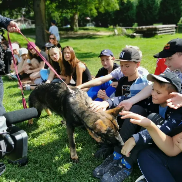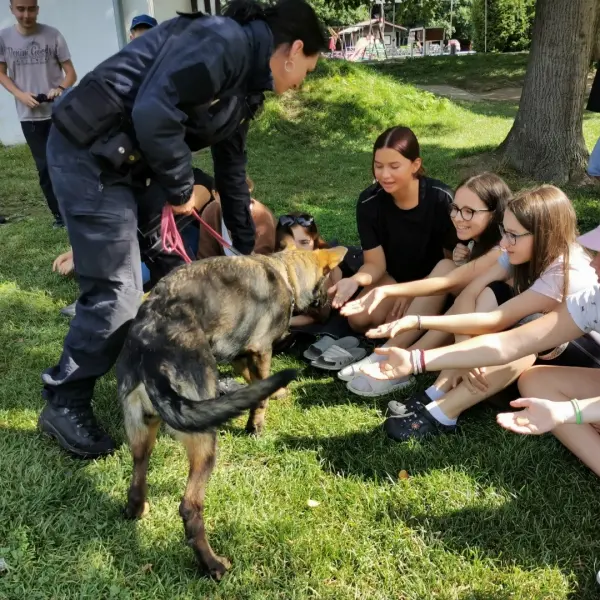Dopoledne to byla doslova psina. Tři fenky, z toho jedno ještě úplně rozlítané osmiměsíční štěně, nám ukázaly, že se dovedou s nejedním živlem dobře poradit. Došlo na odzbrojování, vyhledávání předmětů a lidí a samozřejmě i na obligatorní rukáv. Holky psovodky (existuje tohle slovo?) měly psy tak zvládnuté, že dovolily i některým z nás dospělých Dvojkařů nechat se za rukáv chytit. A je to věc, když na vás běží pětatřicet kilo zubů! Děti se samozřejmě také domáhaly aktivní účasti na hryzavé zábavě, ale my jsme byli neoblomní. Stačí, že je hryžou komáři a ovádi. Na závěr si mohly děti dva pejsky pomazlit. Krmení piškoty a kontakt na blízko byl pro ně jednoznačně zážitek, když se ukázalo, že fenky jsou „mimo službu“ neuvěřitelně přítulné a kamarádské.