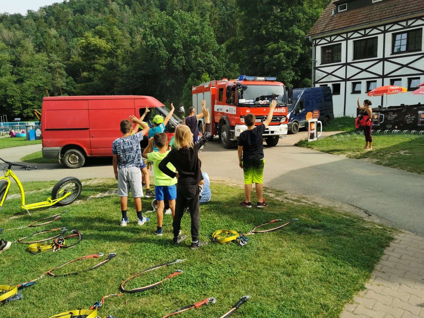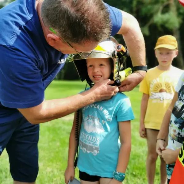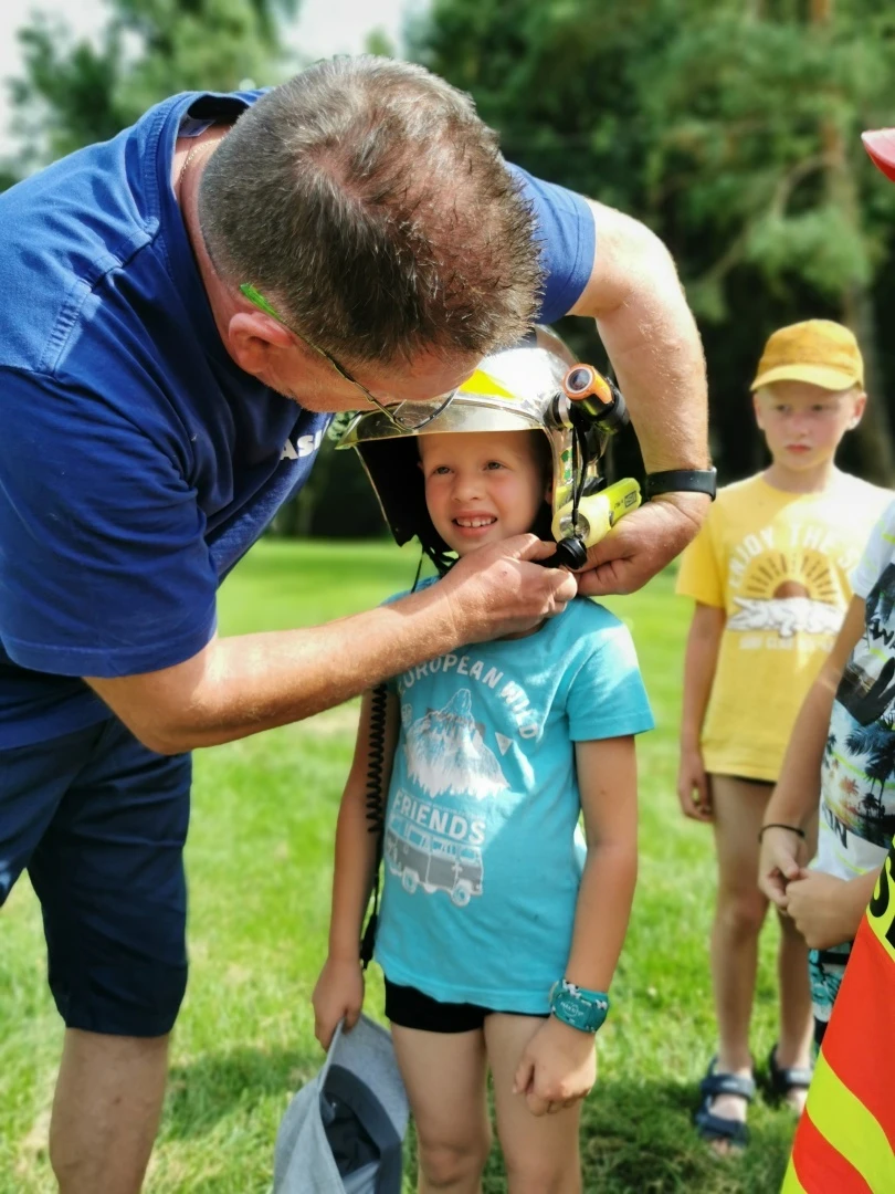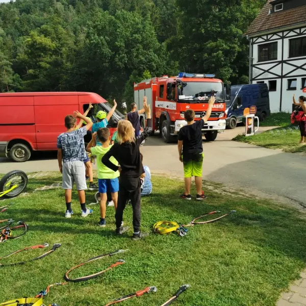 Odpoledne, když jsme strávili nálož buchtiček se šodo, se pro změnu ukázali kamarádi od jiného řemesla, a sice od řemesla hasičského. Tady se samozřejmě ukázalo, že každý kluk má někde hluboko uvnitř ukrytou touhu stát se požárníkem, stejně jako pověstný dráček Soptík. Prolezli jsme si auťák od nápravy po sirénu. Děti si vyzkoušely požární a záchrannou techniku a zahrnuly kolegy tunou otázek.