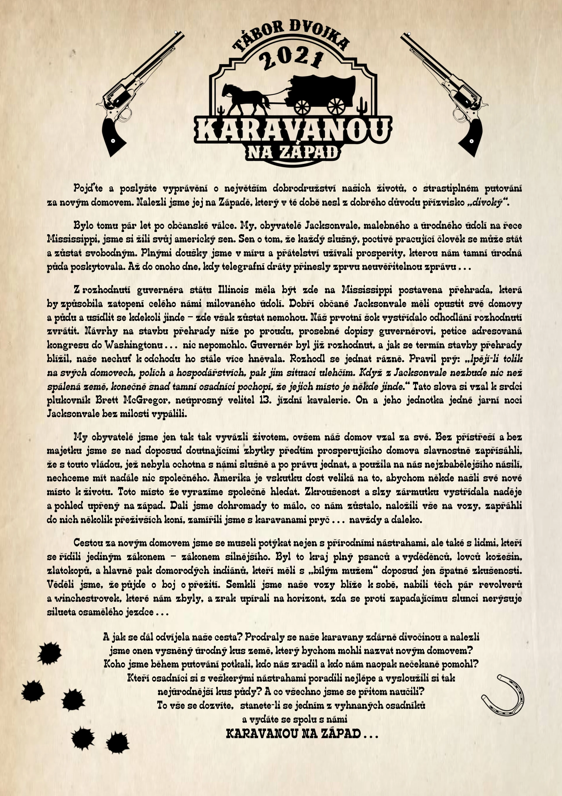 jste určitě dychtiví dozvědět se něco víc o tématu letošní celotáborovky. Jistě vám neunikly logo a název, které vám mohly něco málo napovědět. Jsme si ale dobře vědomi toho, že to vaši zvědavost nemohlo dostatečně uspokojit... S velkou radostí vás nyní můžeme seznámit se základním schématem letošní hry. Odpoví vám přinejmenším na otázky kdy, odkud, s kým a proč ony "karavany na západ" pojedou. Pozorný čtenář se také dozví, že nebudeme zdolávat jen nekonečné míle a přírodní překážky, ale i úklady ryze lidské. Pochopí též, že sice budeme do jisté míry konkurenty v hledání nového domova, ale ve výsledku bude nejdůležitější držet při sobě. V indiánských lovištích při nočním vytí vlků v prérii či ve zdánlivě opuštěném městě duchů v poušti se totiž parťáci po boku sakramentsky hodí. Zvlášť, když mají revolver nabitý ostrými...